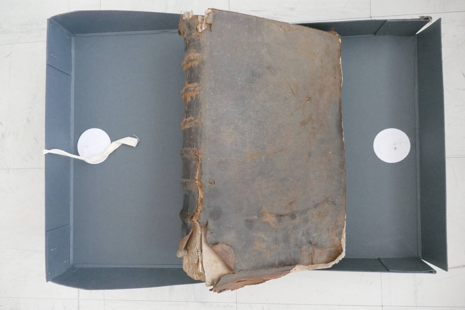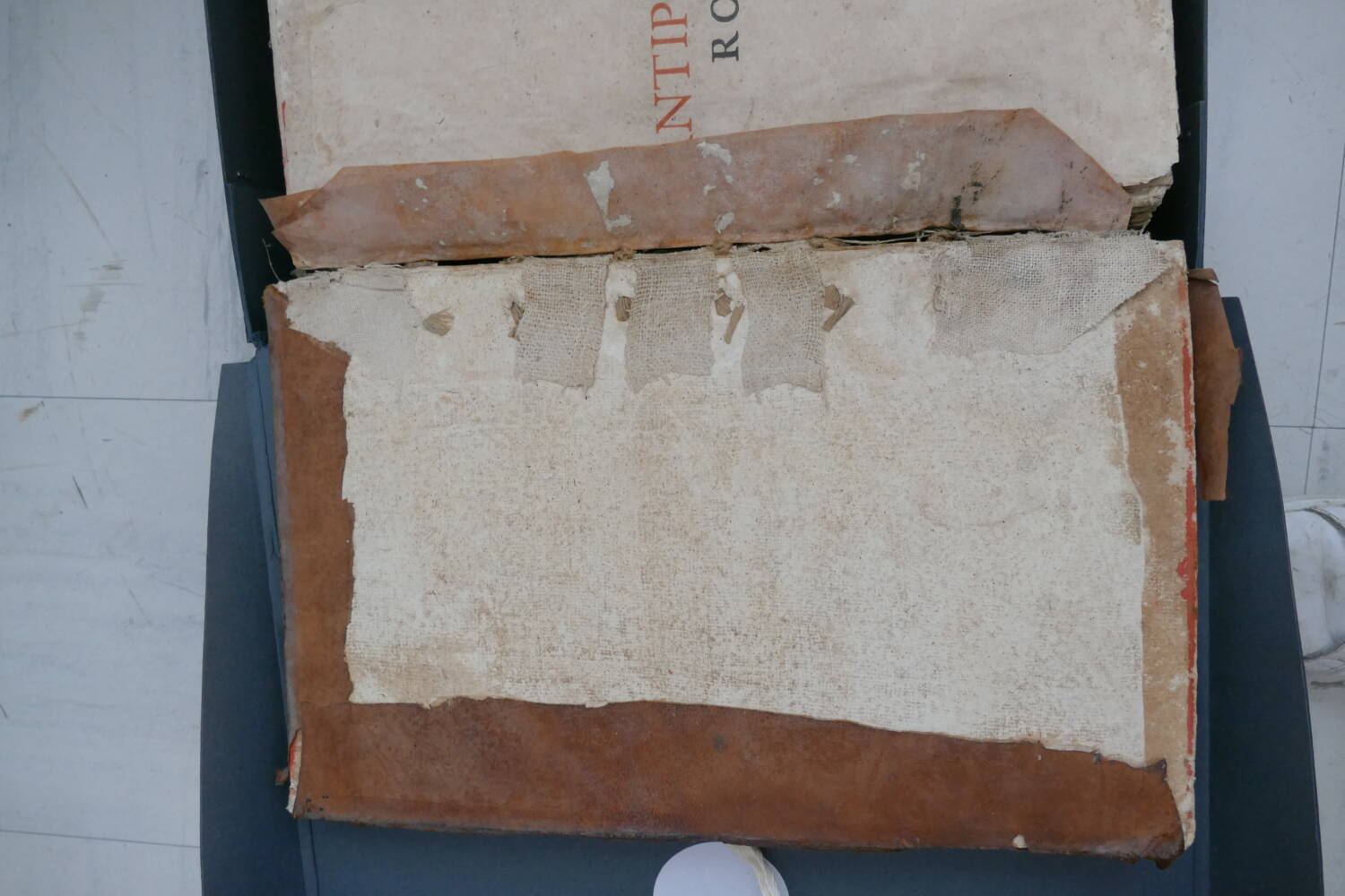 Mais avant cela, il a besoin d’une restauration en profondeur : bien que les pages soient toutes conservées et en plutôt bon état, il pâtit de l’environnement humide et poussiéreux dans lequel il a été entreposé depuis les années 1835, remplacé alors par des exemplaires plus récents. Des traces de moisissures altèrent les bordures et la reliure est très endommagée : les cartonnages se décollent, le cuir est sec et cassant, les coutures et nerfs du dos sont visibles à l’œil nu.