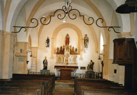 La paroisse d’Aprey était située avant la Révolution dans l’ancien doyenné de Langres. La cure avec ses dîmes avait été donnée en 1044 par l’évêque Hugues de Breteuil au prieuré de Saint-Geosmes dont le titulaire était alors saint Odolric devenu par la suite archevêque de Lyon. La nomination du curé dépendait du prieur puis de l’abbaye à laquelle le prieuré fut uni au XVIIIe siècle. L’église dédiée à saint Bénigne est d’un plan très simple : la nef précédée d’un clocher-porche comporte trois travées prolongées par un chœur à chevet plat et accostées de deux chapelles, au sud chapelle de l’Ange Gardien d’une travée, au nord chapelle de la Vierge de trois travées. La plus grande partie de l’édifice est du XVIe s. à l’exception de la base du clocher qui peut être du XVe et d’un fragment du mur gouttereau sud où se trouve une jolie porte latérale à tympan trilobé. Seule une fenêtre du chœur a gardé son remplage Renaissance, les autres fenêtres ont été modifiées au XIXe siècle. La porte occidentale a été pourvue à l’époque classique d’un décor monumental : pilastres, corniche, pots de feu et niche. Tout l’édifice est voûté sur des croisées d’ogives. On citera dans le mobilier deux panneaux de bois sculpté polychromes du XVIIe siècle: celui de l’Ange Gardien dans son encadrement de retable, l’autre consacré à la remise du rosaire à saint Dominique et quelques sculptures plus anciennes. L’ensemble des bancs, la chaire sont du XVIIe siècle. La Sauvegarde de l’Art français a accordé une aide de 25 000 F en 1999 pour la réfection des murs et des voûtes.