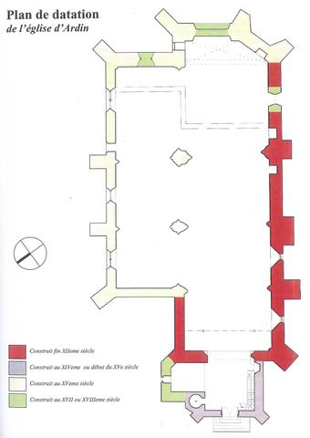 Au XIVe s., avec la réforme du diocèse de Poitiers et son démembrement par suite de la création de ceux de Luçon et de Maillezais (1317), Ardine accède au rang d’archiprêtré. C’est alors qu’est construite la puissante et massive tour du clocher, flanquée d’un escalier à vis, peut-être en lien avec quelques préoccupations défensives. Le groupe sculpté du cavalier disparaît en partie, sans ménagement, dans l’épaisseur des nouvelles maçonneries. Un siècle plus tard, l’église bénéficie d’une nouvelle campagne de travaux avec la création d’un bas-côté au nord et la reprise d’une partie du chœur. L’église est alors voûtée sur croisées d’ogives. De grandes fenêtres au remplage flamboyant viennent éclairer les vaisseaux.