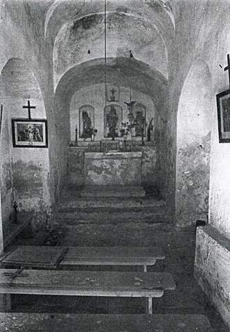La chapelle Sainte-Croix est sans doute, du moins pour sa partie orientale, l’une des plus anciennes de la région. Le chœur semble, en effet, d’époque préromane, alors que la chapelle annexe et la nef, pourvue d’une tribune de bois, sont plus récentes. L’édifice est situé dans un site classé depuis 1944 ; la maison attenante porte, sur sa façade, l’inscription « Doctor de Badia, rector, 1685 ». Cette chapelle où se déroulait régulièrement un pèlerinage le Jeudi Saint a été acquise récemment par une compagnie de Pénitents de la commune, la Confrérie de la Sanch. Celle-ci a dû entreprendre de gros travaux de remise en état, comprenant la réfection totale de la toiture, la reprise du clocheton et le drainage des murs. Les devis s’élevaient à 60 000 F. La Sauvegarde de l’Art français a versé une aide de 10 000 F.