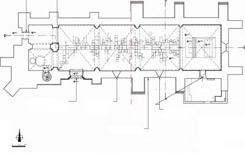 L’édifice est de plan très simple : quatre travées voûtées sur croisées d’ogives, précédées, à l’ouest, d’un vestibule divisé longitudinalement en deux parties inégales ; la plus large, au sud, sert de base au clocher auquel on peut accéder par un escalier à vis englobé dans l’épaisseur du mur ; la partie nord est percée, à l’ouest, d’une petite porte, de date incertaine, très nettement décalée par rapport à l’axe de l’église. La porte principale (très probablement protégée, à l’origine, par un auvent) s’ouvre dans le mur sud de la première travée de la nef.
