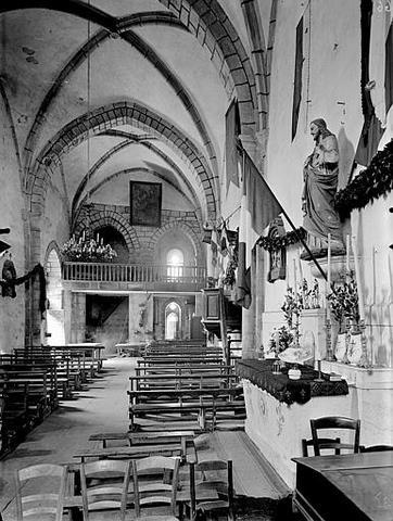 Bien que l’édifice donne une certaine impression d’homogénéité (en partie à cause de l’absence totale d’ouvertures du côté nord), il se compose en fait de deux parties d’époques différentes : les deux premières travées, ainsi sans doute que le vestibule, datent de la fin du XIIe s. ou plus vraisemblablement du début du siècle suivant, comme semblent l’indiquer l’aspect de la voûte sur croisée d’ogives et surtout le décor du portail sud, en arc brisé, dont les chapiteaux des piédroits se prolongent sur les murs latéraux par une frise de feuillages, selon une formule très largement répandue dans les édifices limousins de l’époque gothique.