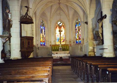 À l’intérieur, on notera la présence, assez inhabituelle, de peintures murales du XVIe s., découvertes vers 1970 dans le chœur : saint Jean présentant un calice, un saint Apôtre non identifié dans le sanctuaire proprement dit, une Chasse de saint Hubert sur le mur fermant le bas-côté sud constitue comme un décor de retable. On signalera aussi d’intéressants fonts baptismaux en pierre d’époque romane (M.H.), témoins d’une première église disparue, deux statues en pierre représentant saint Sulpice (le patron de l’église, XVIe s.) et saint Roch (XVIe s.), une Vierge de Pitié (XVIe s.) et un élément de retable en bois du XVIIe s. dont la peinture représente l’Adoration des Bergers. Cette œuvre d’un peintre anonyme du XVIIe s. n’est pas sans évoquer les réalisations du peintre vosgien Claude Bassot. La chaire à prêcher date du XVIIIe siècle. L’orfèvrerie achetée par la secrète de Remiremont en 1714 à Rivard, orfèvre à Neufchâteau, a malheureusement disparu.