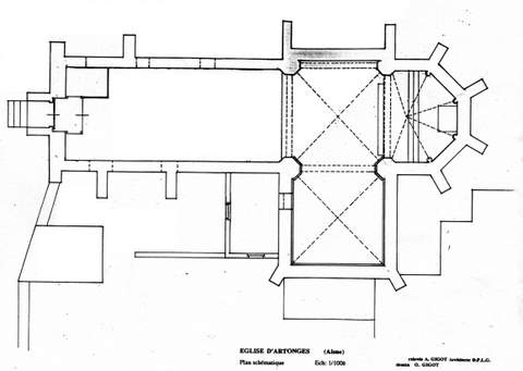 L’église d’Artonges comporte une nef amputée de ses bas-côtés, dont les deux premières travées, si l’on en croit la trace des grandes arcades en plein cintre, doivent remonter à l’époque romane. La troisième travée conserve des traces de grands arcs brisés, peut-être les vestiges d’une croisée de transept. Les parties orientales de l’ édifice, entièrement voûtées d’ogives, sont beaucoup plus imposantes. Elles ont été élevées à la fin du XVIème siècle.
