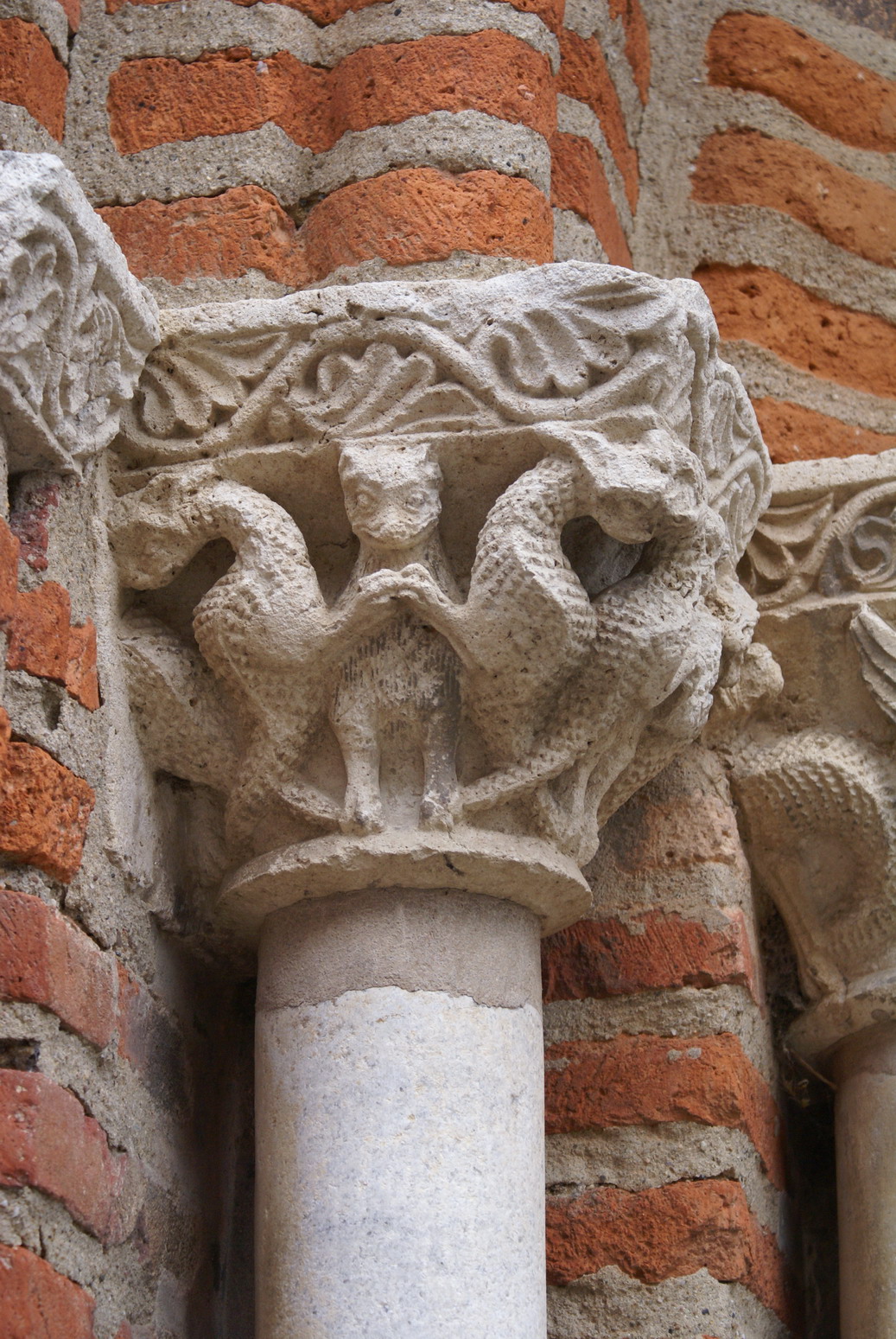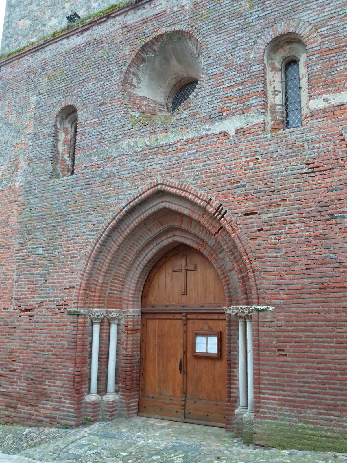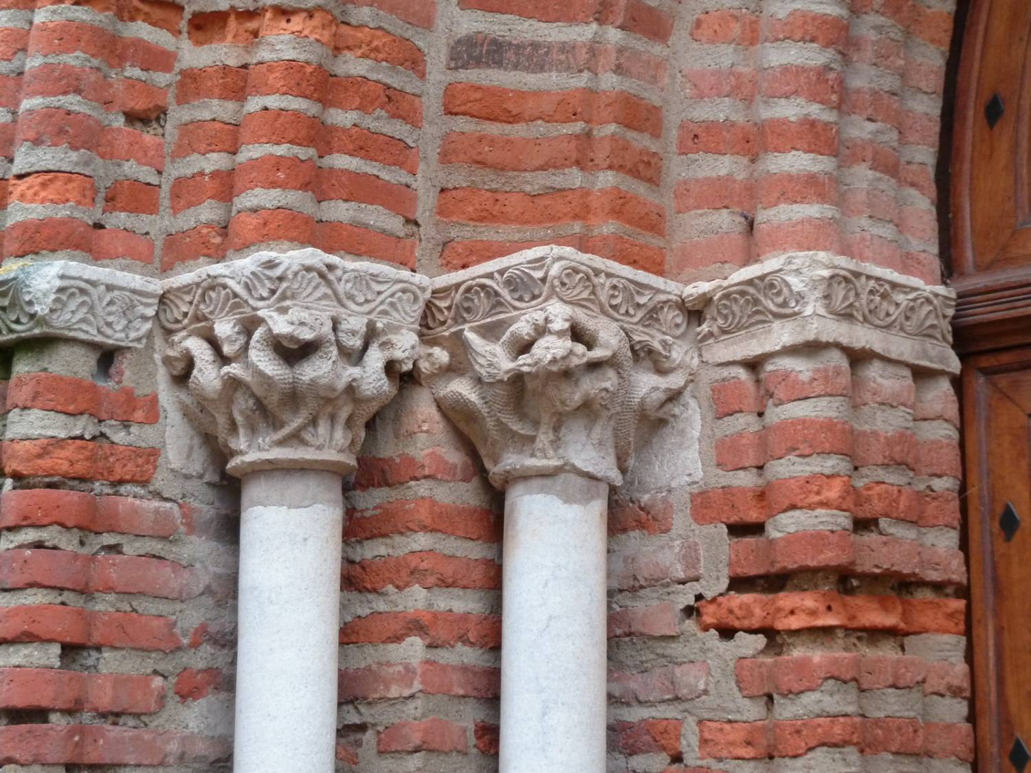 De l’église primitive datable du XIIIe siècle subsiste un exceptionnel portail de transition romano-gothique, se distinguant par un arc brisé à voussures moulurées en briques, des colonnettes en marbre, des chapiteaux sculptés en calcaire, qui font la part belle à tout un bestiaire fantastique et une frise ciselée d’élégantes volutes végétales. La grande qualité du programme sculpté témoigne de la production d’un atelier d’artistes talentueux.