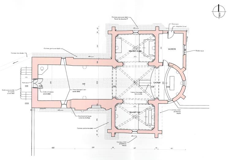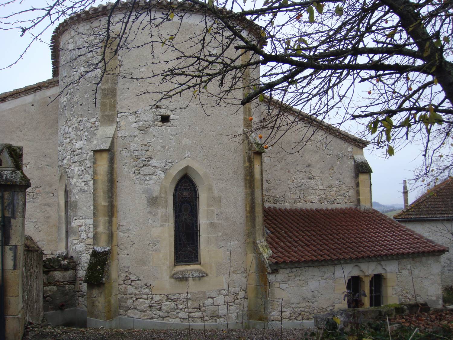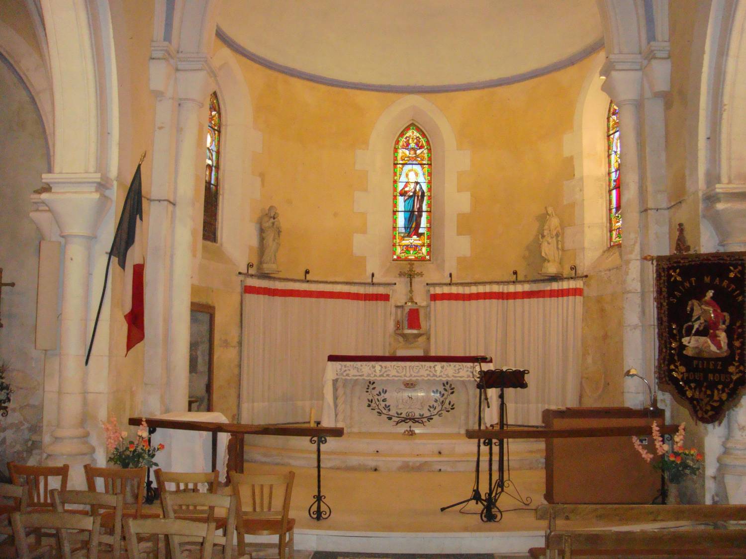 Eglise composée de deux travées de nef poursuivies à l’ouest par une travée ouverte sur deux chapelles au nord et au sud formant un faux transept et un chœur plus élevé que la nef, avec une abside semi circulaire.