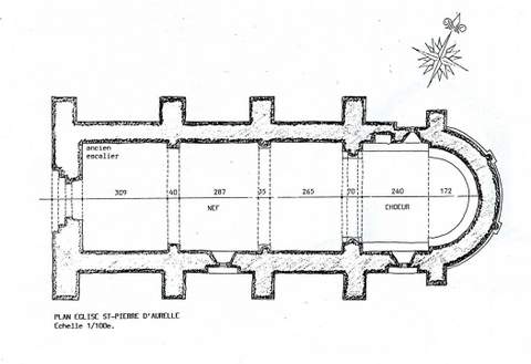 La chapelle Saint-Pierre d’Aurelle, située au cœur d’un ancien village aujourd’hui en ruine, est un petit édifice bâti sur un plan très simple : une nef de trois travées séparées par des arcs doubleaux, une travée droite de chœur puis une abside en hémicycle. Elle n’est pas parfaitement orientée, sans doute pour mieux s’adapter au terrain accidenté.