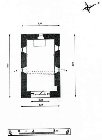 Sous la première fenêtre au sud, près de l’autel en pierre, se trouve une piscine, grossièrement cintrée.