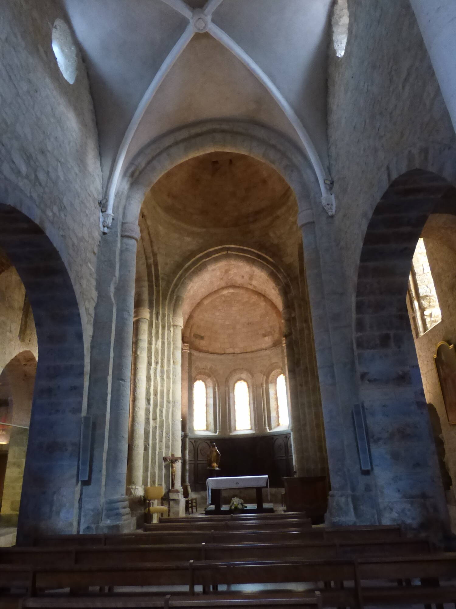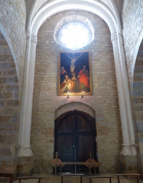 La nef romane, fortement endommagée pendant les guerres de religion, était initialement composée d’un vaisseau unique de deux travées divisées par des arcs-doubleaux en forme de demi-tores, dont il subsiste peut-être encore quelques maçonneries romanes. Elle fut rebâtie à l’identique au XIXe siècle lorsqu’on édifia une nouvelle voûte, sur croisées d’ogives, qui s’est ainsi substituée à la voûte romane en berceau brisé.