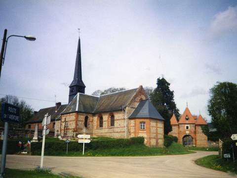 L’édifice dans son volume actuel a, semble-t-il, été reconstruit au XVIIIe siècle. Il se compose d’une nef d’une travée, précédée d’une travée aveugle au-dessus de laquelle s’élève le clocher, d’un transept et d’un chœur à chevet plat, plus développé que la nef. La sacristie à trois pans qui occupe l’extrémité orientale de l’église et communique avec le chœur, est un appendice vraisemblablement postérieur. Construite en briques et silex, à mi-pente du chemin d’accès vers le château, l’église propose un jeu de polychromie avec ses lits réguliers de briques et les encadrements soignés de ses ouvertures. Elle est couronnée par la flèche élevée de son clocher d’ardoises dont une des pièces de la charpente porte l’inscription : « François Bisson 1732 ».