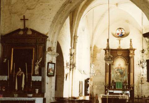 L’église de L’Assomption, enceinte dans son enclos de pierres levées, est un bâtiment complexe. La nef, une simple salle rectangulaire non voûtée, remonterait à la fin du xiie s. et a conservé son portail roman (qui se compose de deux gros rouleaux retombant directement sur les bases) malgré l’adjonction d’un clocher-porche à une date tardive. Le transept bas, aux ogives primitives, date peut-être du début du XIIIe s. mais son bras sud reçut une belle charpente lambrissée au début du xve s., aujourd’hui dissimulée par un faux plafond. Dans cette partie de l’édifice ont été découverts récemment des décors peints des xiiie et xive s. (décor de faux joints, personnages) tandis qu’une litre funéraire se développe dans le croisillon méridional.