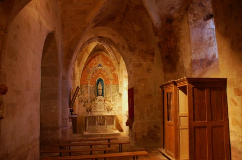 L’intérieur de l’église est voûté d’ogives avec clés de voûte historiées.