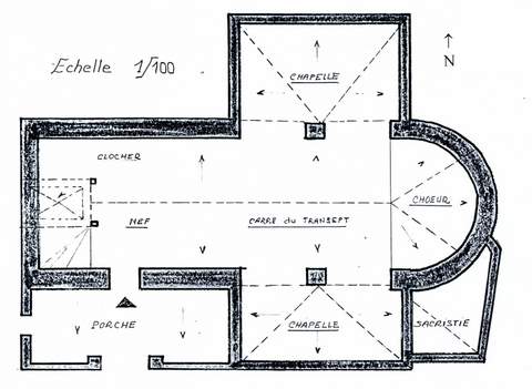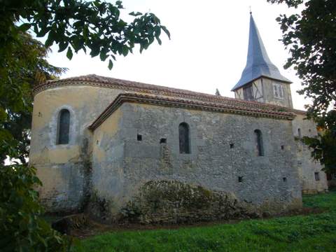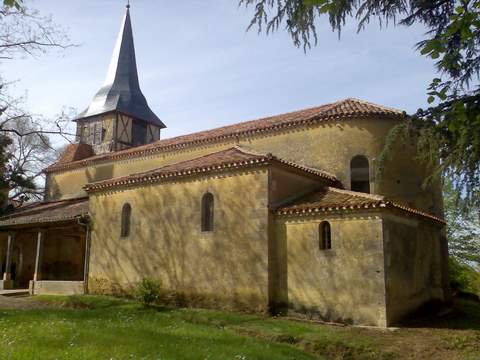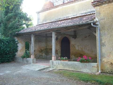 Un tour de l’édifice permet de le vérifier, notamment au nord et à l’ouest, où le mur est, sur une certaine hauteur, plus épais et d’une autre facture. Du côté nord, une baie, qui s’ouvre sous une sorte de pignon, est aussi un vestige de l’édifice précédent, qui devait être moins élevé. La porte d’entrée, située au sud, sous un porche en charpente, est encore médiévale : un simple arc en tiers-point sobrement mouluré. Le plan de l’église est à nef unique, encadré de deux chapelles au nord et au sud, cette dernière prolongée d’une sacristie en retour vers l’abside, en hémicycle. La chapelle nord provient, elle aussi, d’un édifice antérieur : on y voit encore très distinctement, à l’extérieur, une litre funéraire, ce qui indique très clairement la chapelle seigneuriale de la famille des marquis de Maniban, au nom desquels est encore inscrite la cloche, datée de 1771.
