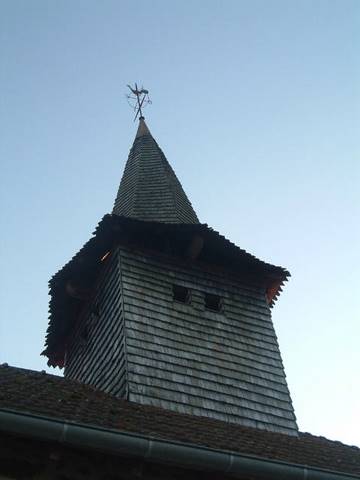 En retrait de la façade, un petit clocher coiffe le pignon. Rectangulaire sous une courte flèche octogonale, il a été refait en bardeaux, conformément à ses dispositions d’origine, dans la restauration en cours.