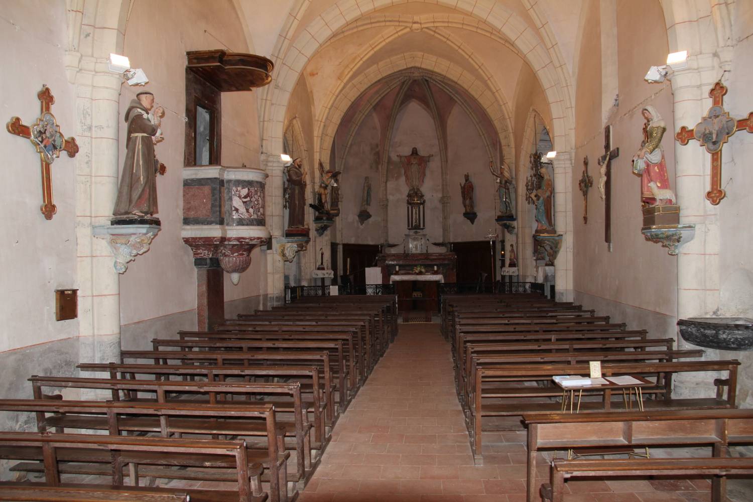 A l’intérieur, l’édifice apparaît divisé en trois travées, couvertes de fausses voûtes d’ogives en briques et en plâtre, dont l’une porte à la clé le millésime 1863 : l’église de Bagnoles ayant été érigée en succursale en 1861, il est probable qu’elle a fait l’objet d’une modernisation à cette occasion. La troisième travée est bordée de deux chapelles au nord et au sud, très modestes : celle du nord, voûtée[3], dédiée à saint Roch, celle du sud, simplement plafonnée, à la Vierge, avec un élégant retable en gypserie néo-classique. Cette travée précède un sanctuaire de plan polygonal, couvert d’une voûte à cinq compartiments dont la clé est décorée de motifs trilobés. On remarquera, trait commun à beaucoup d’églises du Minervois ou de l’Aude en général, un beau mobilier en marbre, sans doute du 18e siècle : maître-autel (tombeau en marbre gris et incarnat), fonts baptismaux, chaire à prêcher néo-classique avec une belle polychromie.