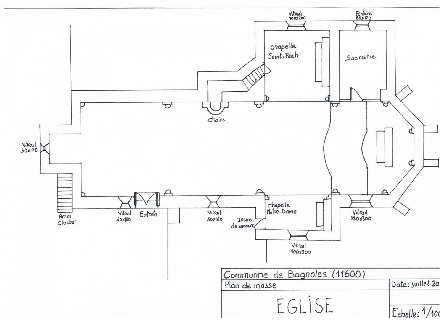 Comme le village de Trausse, Bagnoles est une seigneurie dépendant de l’abbaye bénédictine de Caunes-Minervois, qui en possédait cinq, dont le bourg de Caunes lui-même. Seigneur et décimateur, c’est à elle que revenait d’entretenir — ou de reconstruire — l’église, comme d’en nommer le curé, avec l’accord de l’évêque de Carcassonne, comme on le voit en 1301[1]. Un plan dressé en 1791 indique très clairement au centre du village l’emplacement du château, ou fort, entouré de fossés, incluant le presbytère et une maison de l’abbé de Caunes. L’église se trouve juste à l’extérieur de l’enceinte, en face de la tour située au centre du fort, toujours conservée.