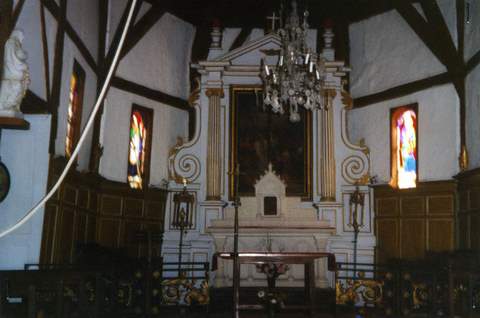 L’intérieur, non enduit, laisse apparaître sablières et poteaux. Le chœur est orné de boiseries et d’un retable classique à volutes. L’église renferme des fonts baptismaux du XIIe s., une Vierge de Pitié du XVIe s. et une statue de sainte Hélène classées au titre des objets mobiliers.
