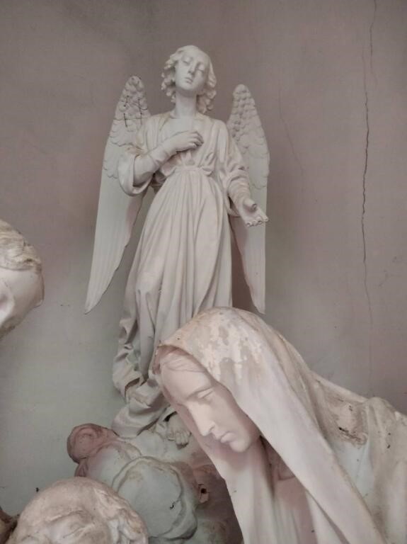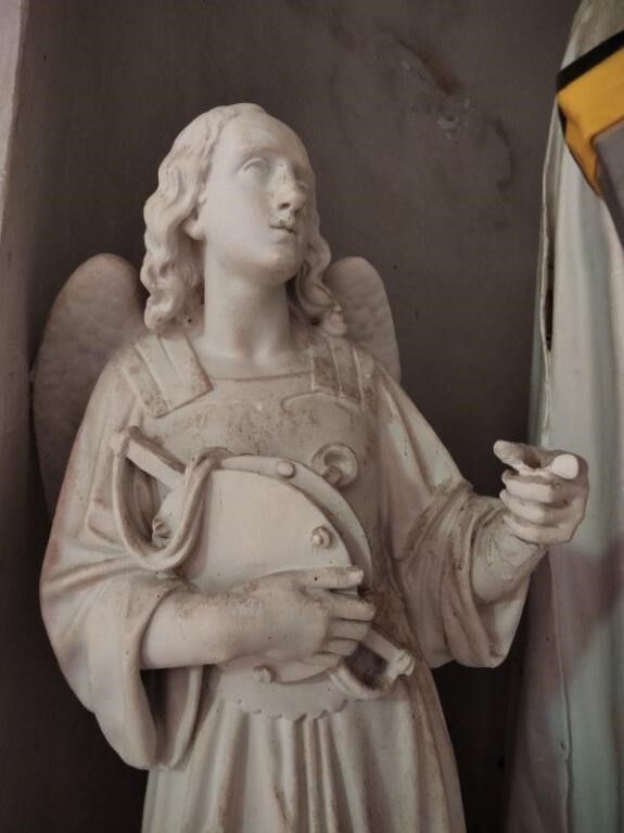 Parmi les œuvres remarquables de la chapelle se trouve un groupe sculpté intitulé La Mort de saint Joseph, réalisé par Jean-Marie Valentin dans les années 1850-1860. Ce groupe de 330 cm sur 300 cm illustre un moment poignant de la vie de saint Joseph, et il est attribué à l’artiste Valentin, bien que des incertitudes persistent quant à sa commande. Présentée à l’intérieur de la chapelle, l’œuvre se distingue par son expression dramatique et son détail sculptural, apportant une dimension spirituelle et artistique à ce lieu. Le groupe a été mentionné dans plusieurs publications historiques, soulignant son importance dans le patrimoine local et religieux de Montfort.