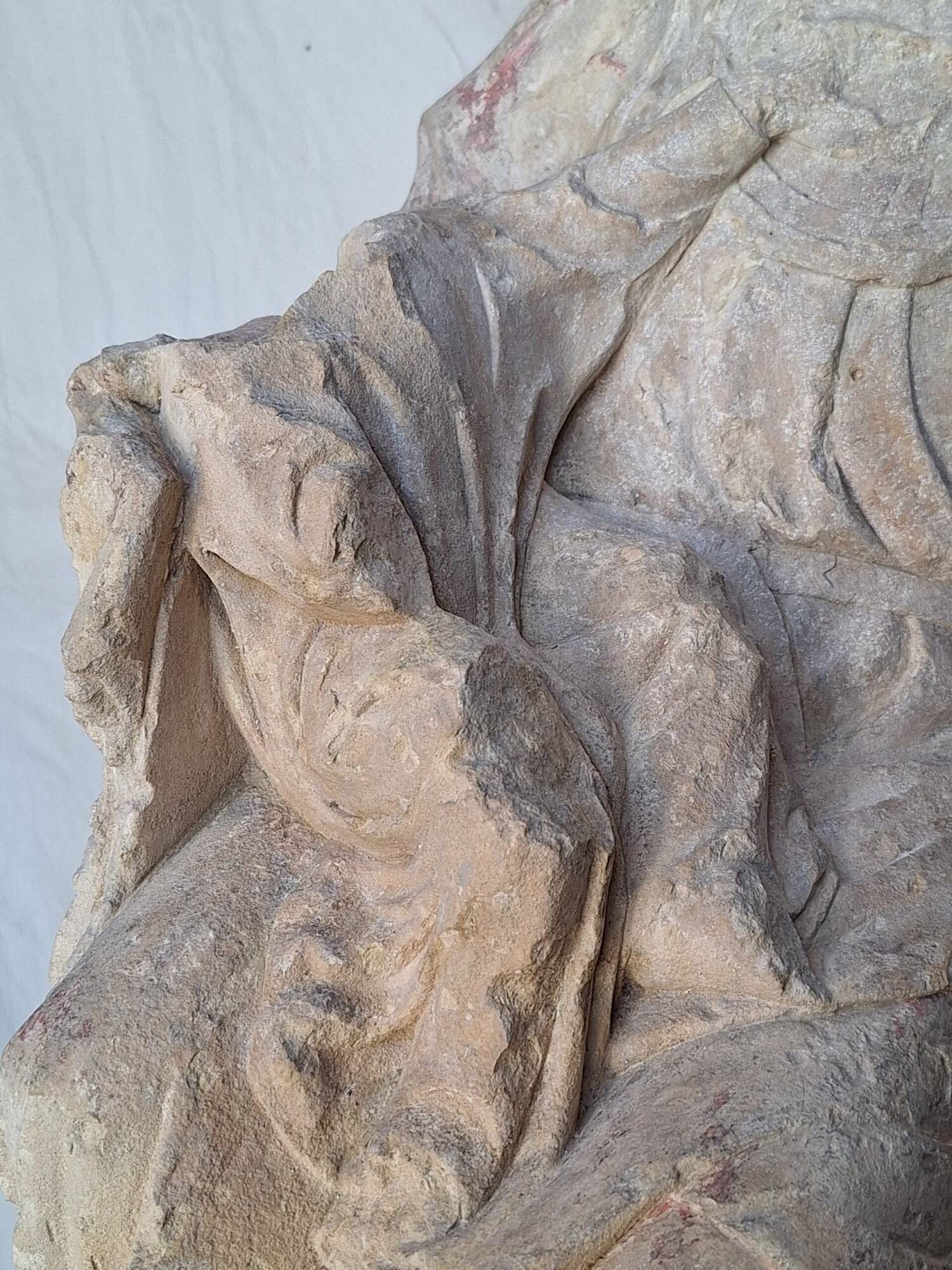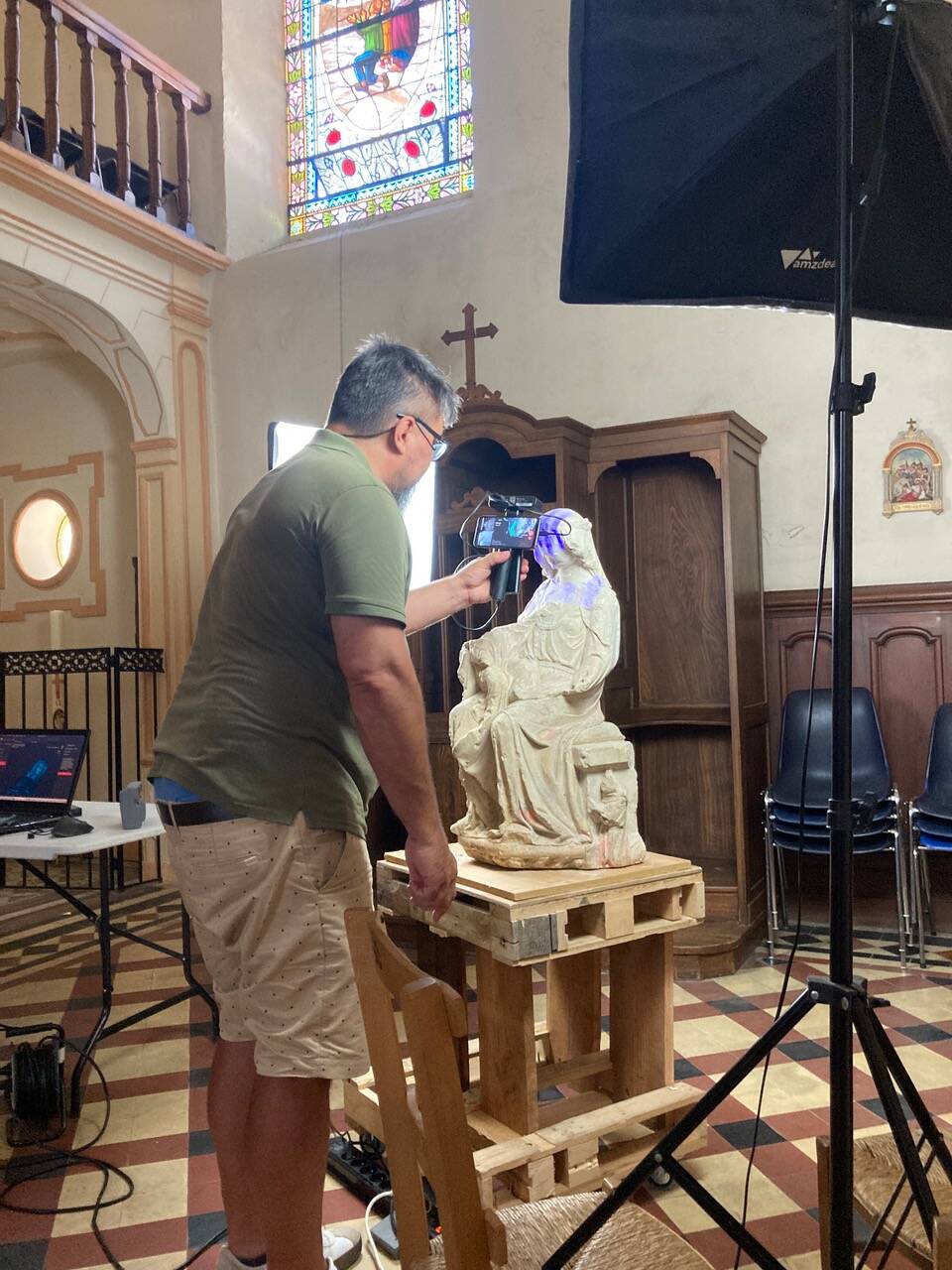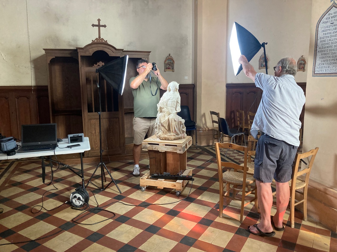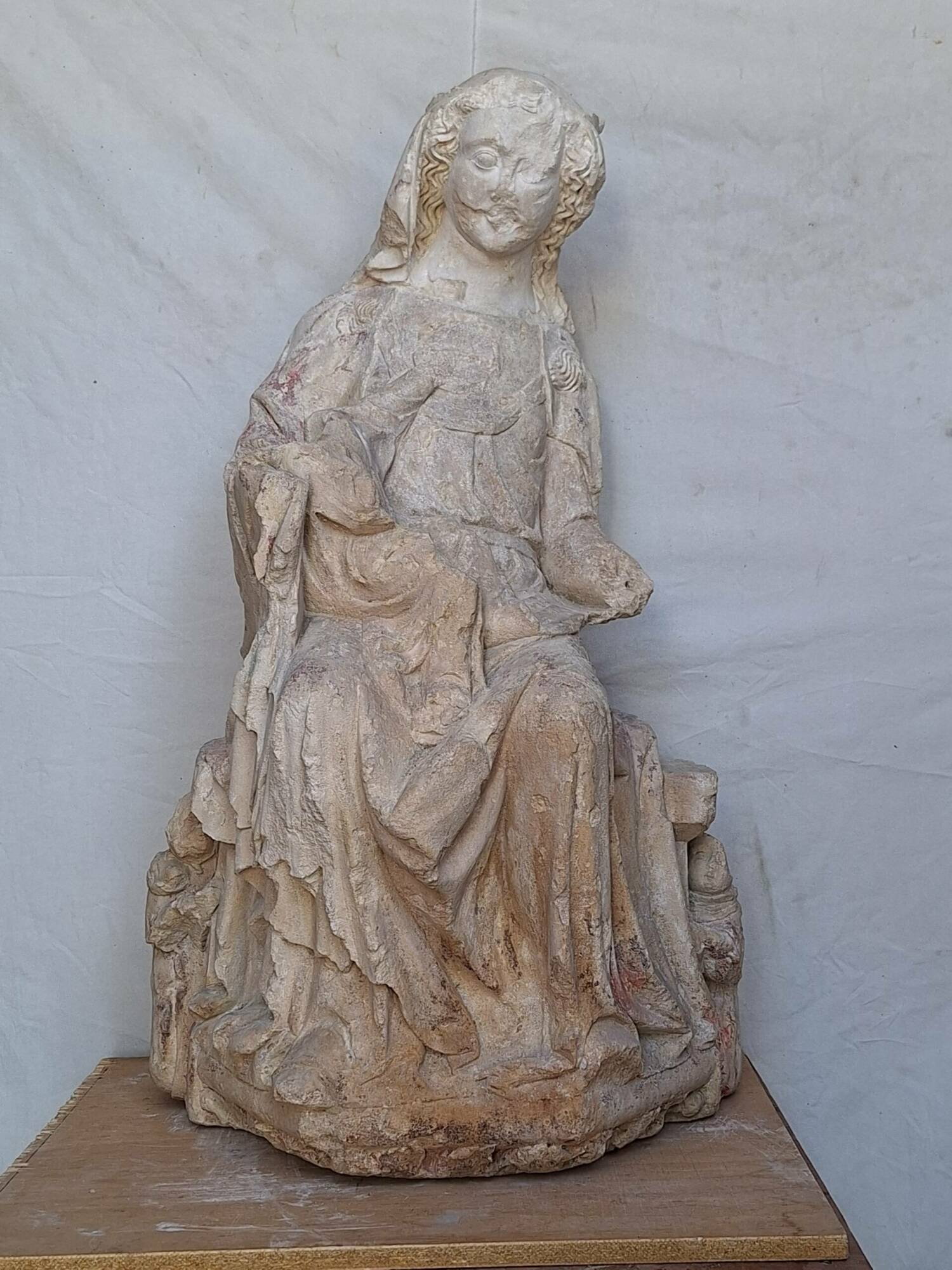 Exposée à l’humidité et aux intempéries pendant des siècles au-dessus de sa source, la statue était en très mauvais état, couverte de mousse et cassée en de nombreux endroits. Elle nécessitait donc des travaux de restauration urgents pour préserver sa beauté et son intégrité, mais aussi pour en apprendre davantage sur son origine et son histoire. Après de longues discussions entre la mairie, les conservateurs et la Sauvegarde, il a été décidé de restaurer la statue puis d’en faire une réplique 3D à replacer dans son oratoire, afin de préserver l’original dans l’église du village, à l’abri des intempéries . La restauration minutieuse effectuée par Delphine Masson a ainsi permis de dater la statue de la fin du XIVe siècle, soit beaucoup plus ancienne et précieuse que son état initial ne le laissait paraître. Le haut du corps de l’Enfant a été recollé, et la main gauche de la Vierge restaurée. Un dépoussiérage minutieux a également permis d’éliminer les salissures accumulées au fil du temps, et une reconsolidation de la structure en pierre pour éviter toute fragilisation supplémentaire.