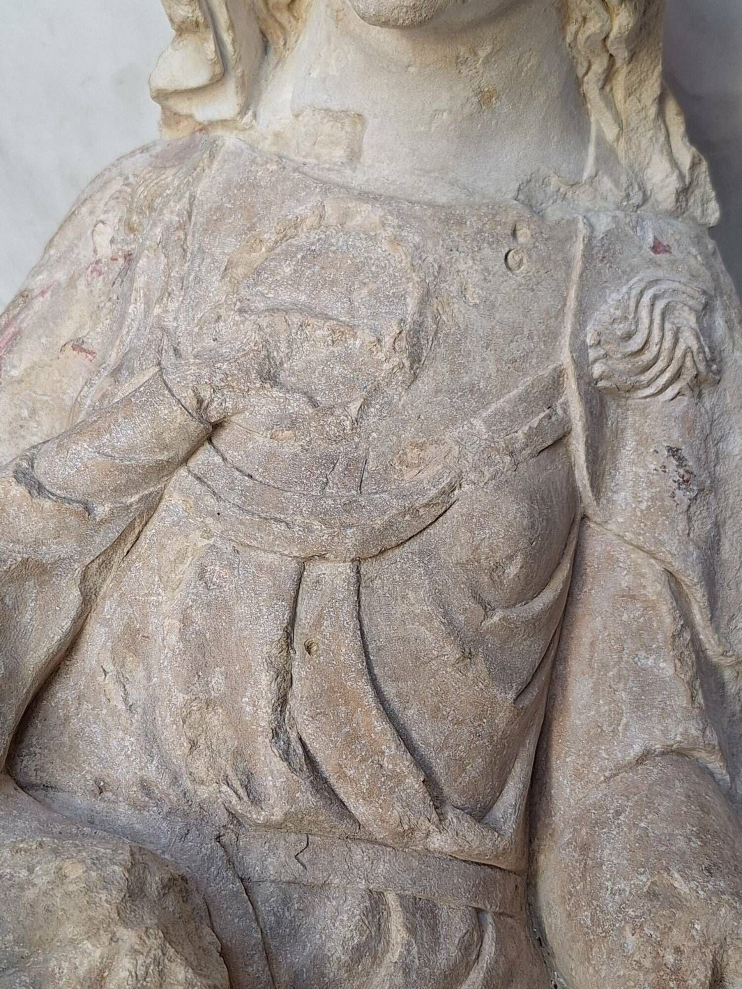 Au pied de la Vierge, on remarque deux petits personnages, appuyés contre les pieds du tabouret, qui seraient des représentations des donateurs de la statue, ajoutant une dimension historique et personnelle à l’œuvre. Cette sculpture, bien que fragilisée, demeure un témoignage émouvant de la dévotion locale et de l’histoire de ce lieu de pèlerinage.