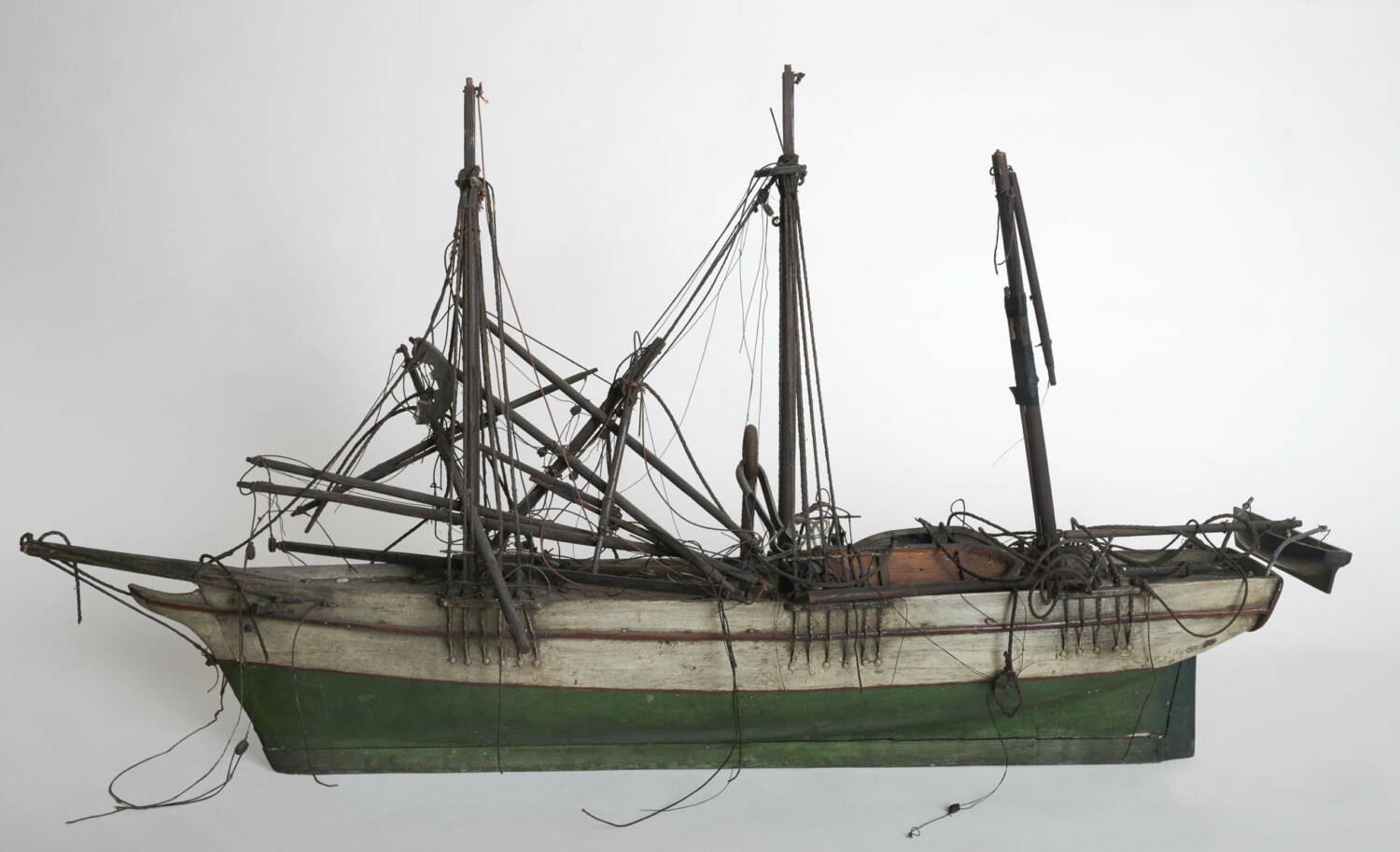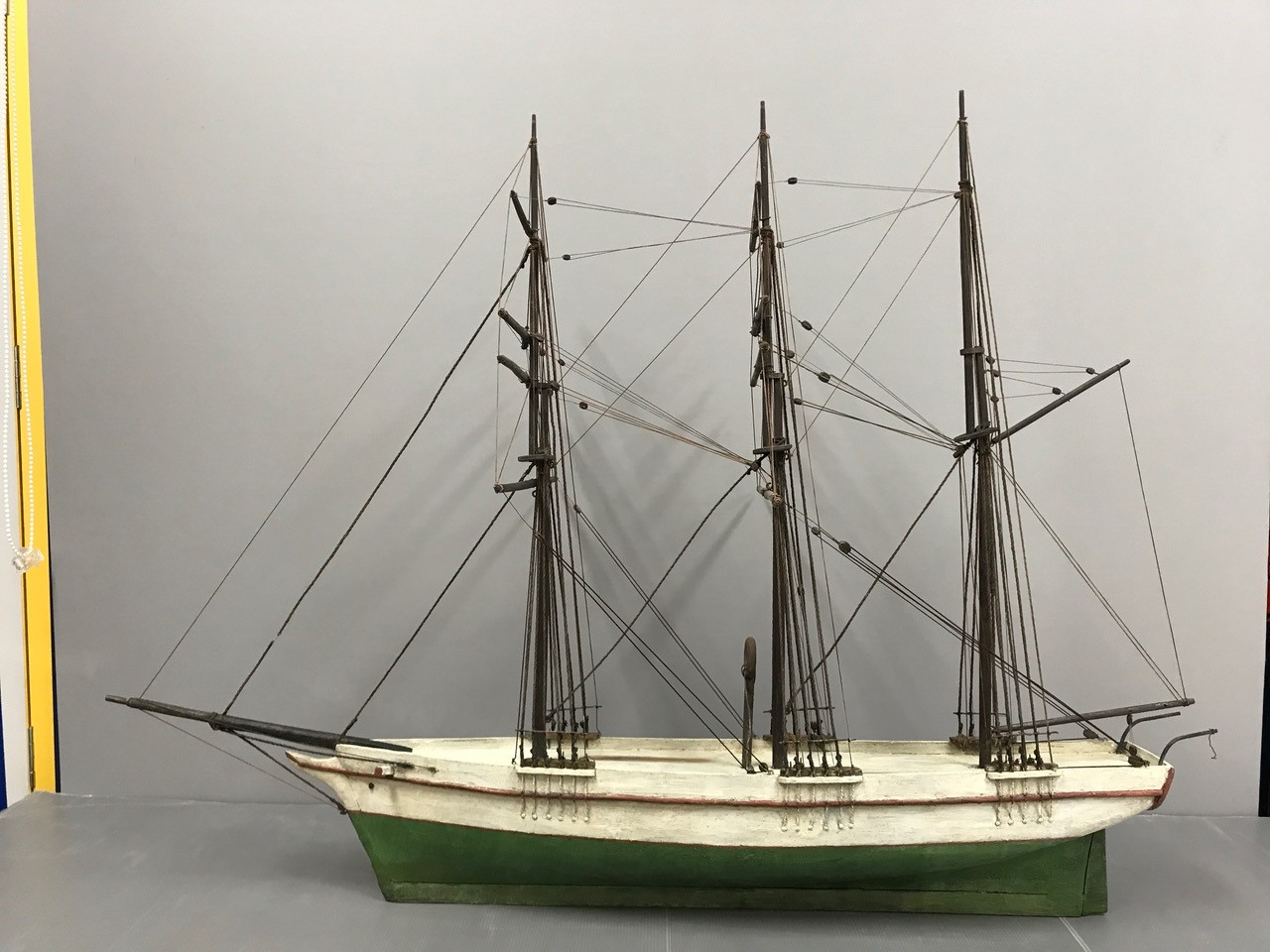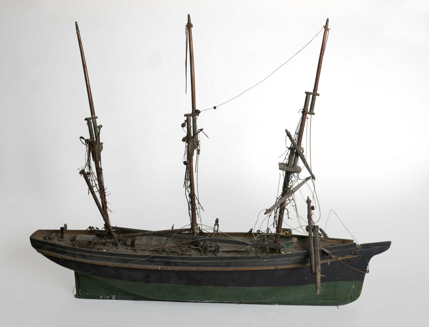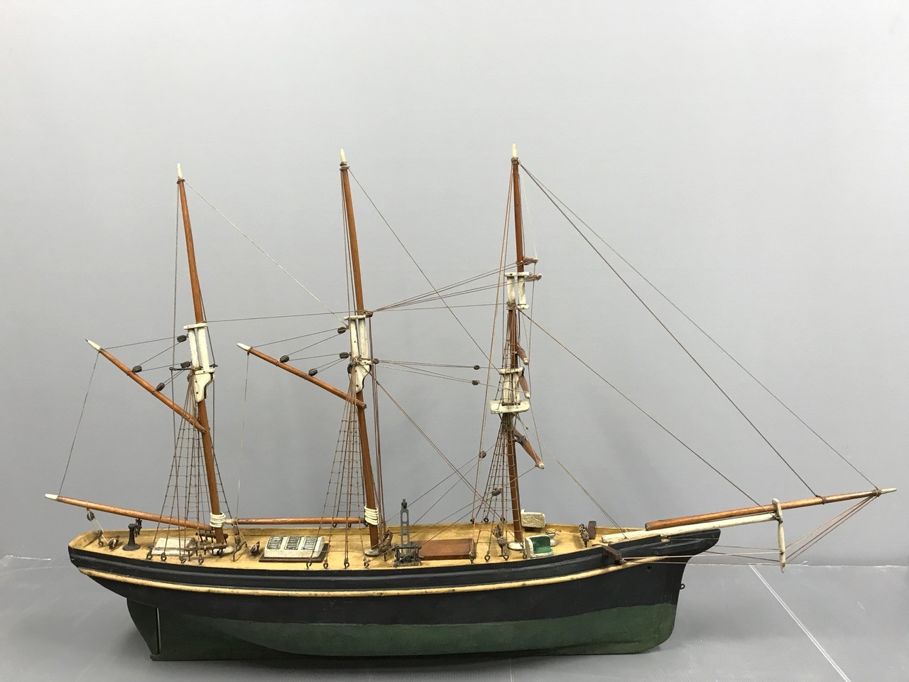« Lorsque des maquettes de bateaux ou des sculptures sur bois arrivent à l’atelier, je fais d’abord un premier bilan de leur état, tout en faisant des recherches historiques afin de comprendre la technique de construction utilisée au début du siècle dernier pour l’une, et dans les années 1920-1930 pour l’autre. Il s’est avéré que les deux maquettes dunkerquoises – un trois-mâts barque vert et blanc et un trois-mâts goélette noir et vert -, étaient fort abimées avec notamment de multiples fractures de mâts et des cordages en très mauvais état ou quasi-inexistants, car les fines fibres textiles employées n’apprécient ni les UV, ni les poussières, ni l’humidité. Au total, leur restauration a nécessité un an de travail : 190 heures pour l’une et 150 heures pour l’autre.