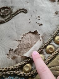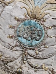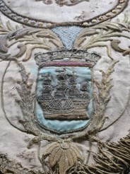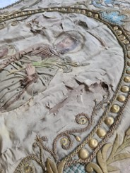 Ensuite, la soie, affaiblie par le temps et les éléments, sera restaurée. Cette étape peut comprendre la consolidation des zones fragilisées et la réparation des déchirures, tout en veillant à maintenir l’intégrité originale de la bannière.La troisième phase concernera la restauration des broderies, véritables œuvres d’art qui ornent la bannière. Les fils usés ou manquants seront remplacés, en respectant les techniques et les couleurs d’origine pour préserver l’esthétique de la bannière