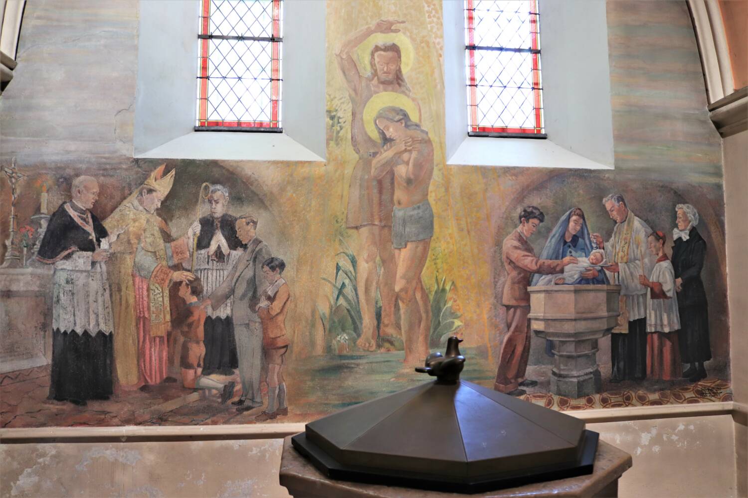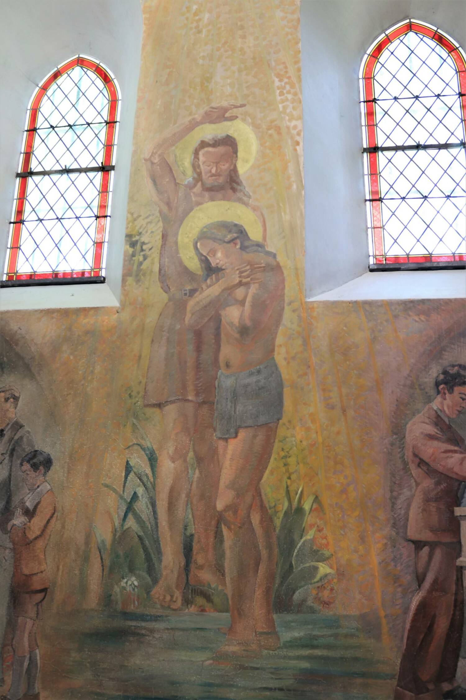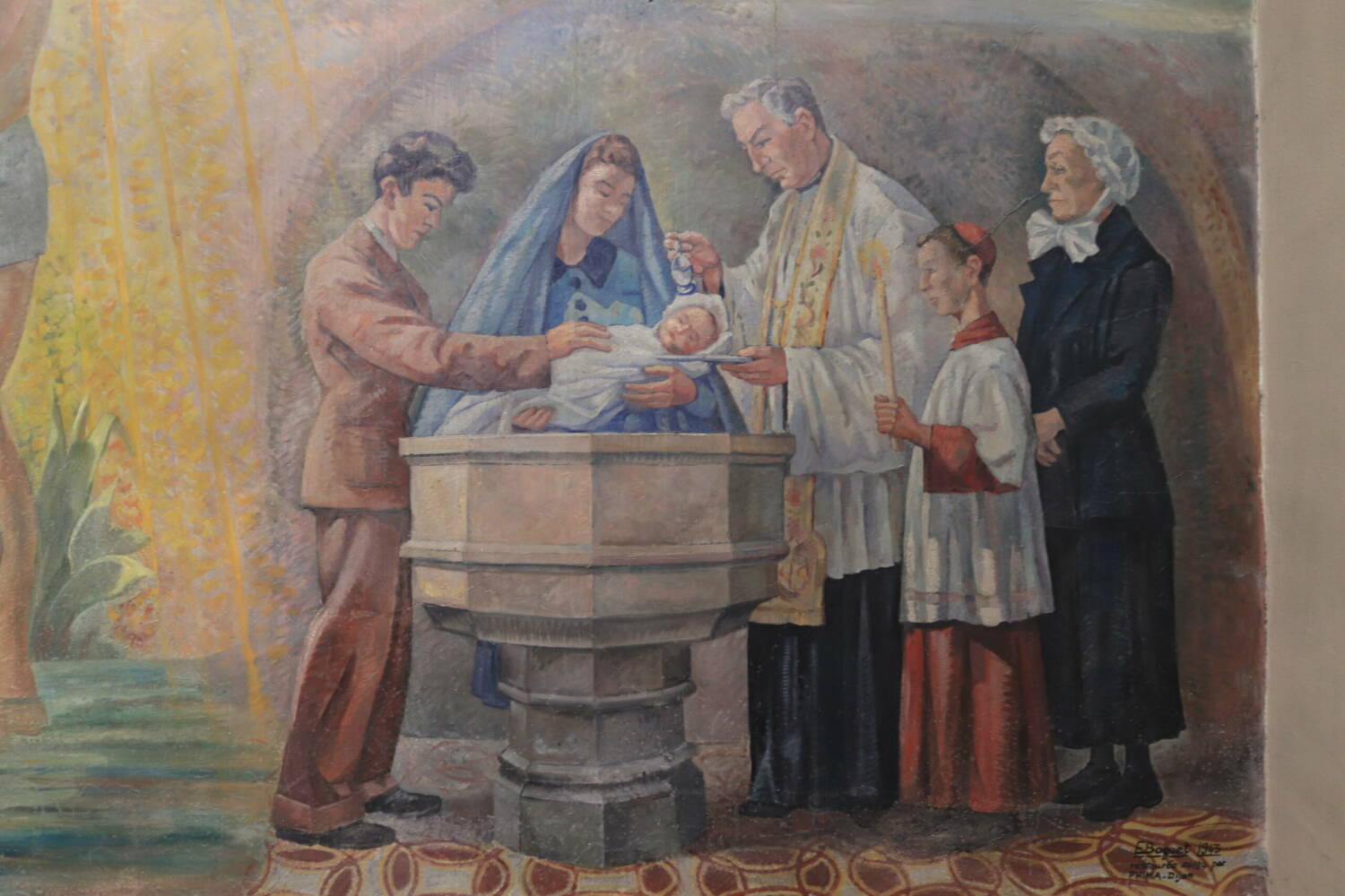 La partie droite de la fresque représente le baptême d’un enfant. Ce sacrement marque le début de la vie d’un chrétien. Autour de l’enfant,sont présentes cinq personnes dont la marraine, le parrain, le prêtre dont l’étole jaune rappelle la couleur dominante du baptême du Christ. Un enfant de cœur tient une bougie, symbolisant l’Esprit Saint alors que le prêtre verse l’eau sur la tête de l’enfant.