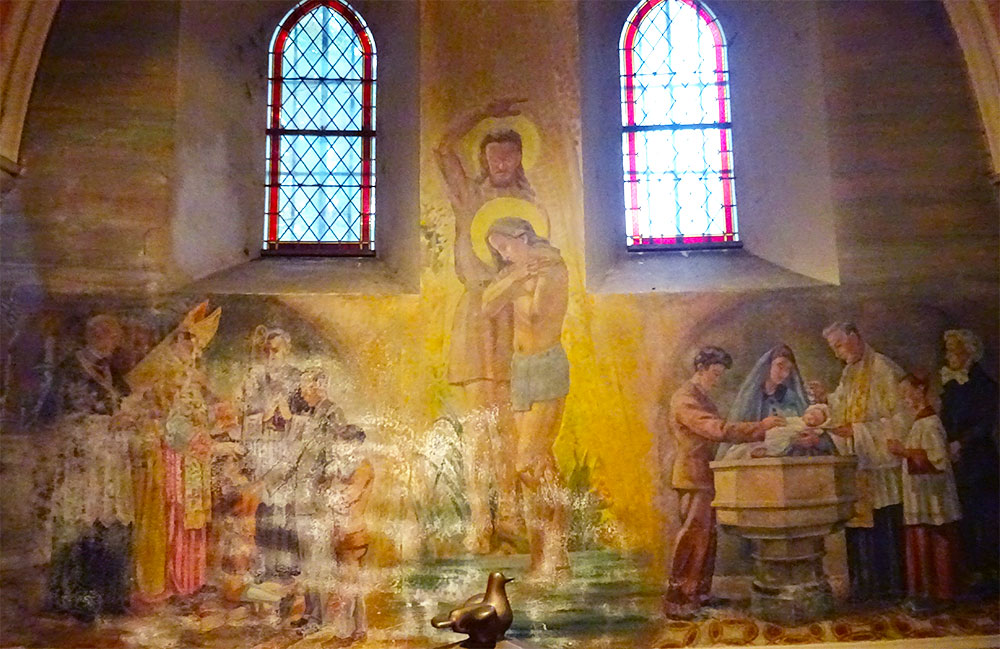 L’œuvre d’Ernest Boguet s’inscrit dans la tradition des représentations religieuses, à travers un évènement fondateur, le baptême du Christ, et l’image de deux sacrements primordiaux. En effet, le baptême est le fondement de toute la vie chrétienne et marque l’accès aux autres sacrements. Il est traditionnellement célébré par un prêtre en présence des parrains et marraines, présents dans la fresque de Boguet. La confirmation achève le baptême et inscrit pleinement le croyant dans la vie chrétienne. Ce sacrement est réservé à ceux qui ont atteint « l’âge de raison » et est administré par l’évêque. Ainsi, Boguet a effectivement peint un jeune garçon recevant la confirmation de la part de l’évêque en chape dorée.