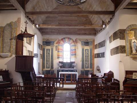 L’autel de bois polychrome porte un Agneau peint sur un fond de paysage d’orage entre deux vases de fleurs en trompe-l’œil. Il est surmonté d’un petit tabernacle peint en faux marbre avec applications d’or, où figurent les statuettes en bas-relief de saint Pierre et saint Jean l’Évangéliste. Tout ce mobilier participe du même esprit que le décor mural. De l’ensemble, nettoyé et restauré avec autant de tact que de discrétion, se dégage une spiritualité empreinte d’allégresse. Un siège de célébrant du XVIIIe s. en bois naturel, une statue de saint Benoît en bois polychromé, une chaire plus que simple dans l’esprit classique et une table de communion à balustres tournés complètent le mobilier ancien, ainsi qu’une tribune à escalier de bois dressée au revers de la façade. On doit signaler en outre, dans la baie d’axe, un vitrail moderne avec les trois croix du calvaire, et la présence de vingt-sept harmoniums, qui font de cette petite église un véritable musée de cet instrument.