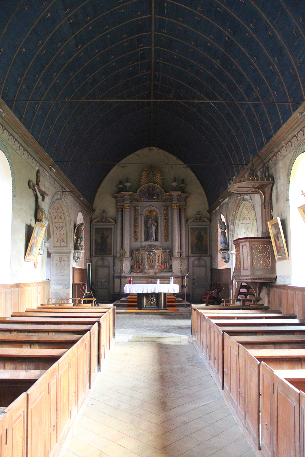 L’église Notre-Dame est composée d’une nef de plan rectangulaire et d’un choeur à chevet plat dans la continuité de la nef. Un clocher charpenté surmonte la deuxième travée de la nef et deux chapelles au nord et au sud, à la jonction du choeur et de la nef forment transept. Les couvertures sont en ardoises et les murs en moellons enduits. Une sacristie est accolée au mur pignon ouest.