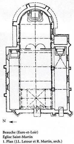Située dans le Thimerais, à l’intersection de l’ancienne voie romaine reliant Dreux à Mortagne-au-Perche, le village de Beauche comptait jadis sur son territoire la seigneurie de Beaumarchais, fief de la famille des Gués du XIe au XVIIIe s., protectrice de la paroisse. À telle enseigne, l’église Saint-Martin est l’objet d’une donation de Foulques des Gués à l’abbaye de Saint-Père de Chartres dès 1090. L’édifice est orienté et comprend une nef prolongée par une abside semicirculaire. La nef a été flanquée, à la fin du XVe et au début du XVIe s., de deux collatéraux. Celui du nord, très étroit, est couvert en appentis. En revanche, le bas-côté sud constitue un second vaisseau de trois travées. Il a été réalisé en silex avec chaînage de calcaire tendre et de grès taillé. La nef, le chœur et le bas-côté nord sont couverts d’une charpente apparente. Le collatéral sud est voûté d’ogives et chacun de ses trois pignons est percé d’une baie en plein cintre ornée, à l’intérieur des ébrasements, des armoiries de la famille des Gués. La grande fenêtre axiale de style gothique flamboyant a été murée, probablement au XVIIIe s., afin d’élever le retable du maître-autel. La façade ouest est percée, au centre, par un portail en plein cintre souligné de moellons taillés dans le grison. À droite, une porte rectangulaire ouvrant sur le bas-côté sud est surmontée d’un linteau en calcaire tendre de Vernon, décoré d’élégants motifs végétaux, supportant un cartouche coiffé d’un fronton triangulaire et encadré d’urnes. Cet élément pourrait être une réutilisation d’un monument funéraire. En 1889, le large porche en colombage qui abritait ces deux portails a été supprimé. À l’instar d’un grand nombre d’églises du Thimerais, la haute flèche du clocher, de forme hexagonale, recouverte d’ardoise, repose sur un solide ouvrage de charpente en bois à l’entrée de la nef. À l’intérieur, la qualité du mobilier contraste avec la rusticité de la construction. Le maître-autel ainsi que les deux autels latéraux offrent un bel ensemble décoratif du XVIIIe s. : colonnes torses avec pampres, à chapiteaux corinthiens soutenant une corniche à fronton brisé, couronné d’anges encadrant une niche ornée d’une statuette de saint. Pour la réfection des maçonneries de la nef, du transept et du clocher, la couverture et la charpente du clocher, pour la réfection des enduits, la Sauvegarde de l’Art français a accordé une subvention de 120 000 F en 1998.
