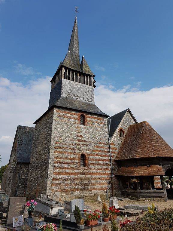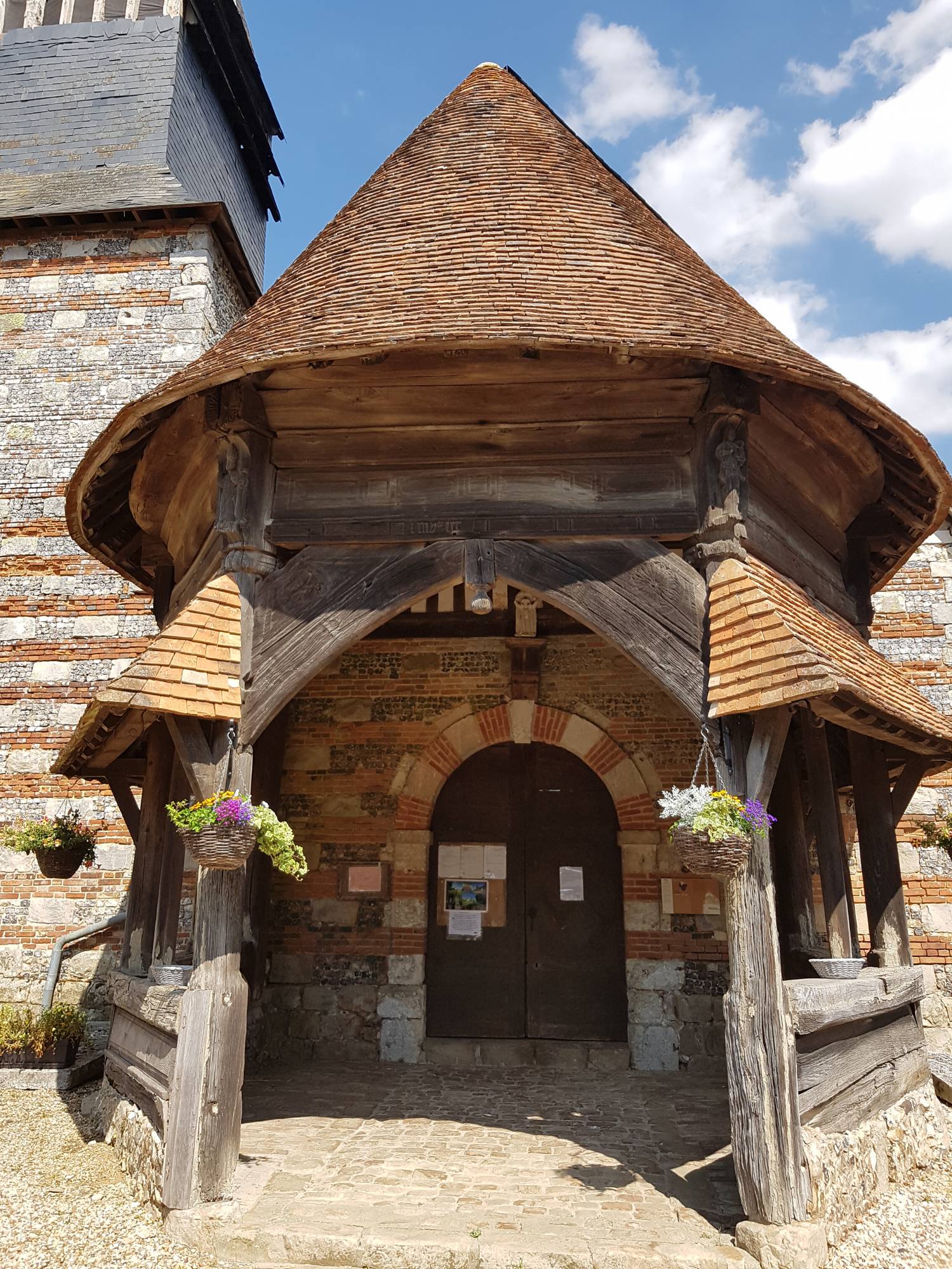 – à l’Ouest, un porche d’entrée à 5 pans, à claire voie. Le porche est en charpente monté sur un bahut bas en silex. couvert d’un toit à croupe polygonale de tuiles et soutenu par des poteaux avec chapiteau ionique confère à cet imposant édifice un caractère singulier. En outre ce porche de 1570 est soutenu par quatre poteaux présentant des bas-reliefs sculptés représentant plusieurs saints en plus de la Vierge et l’Enfant.