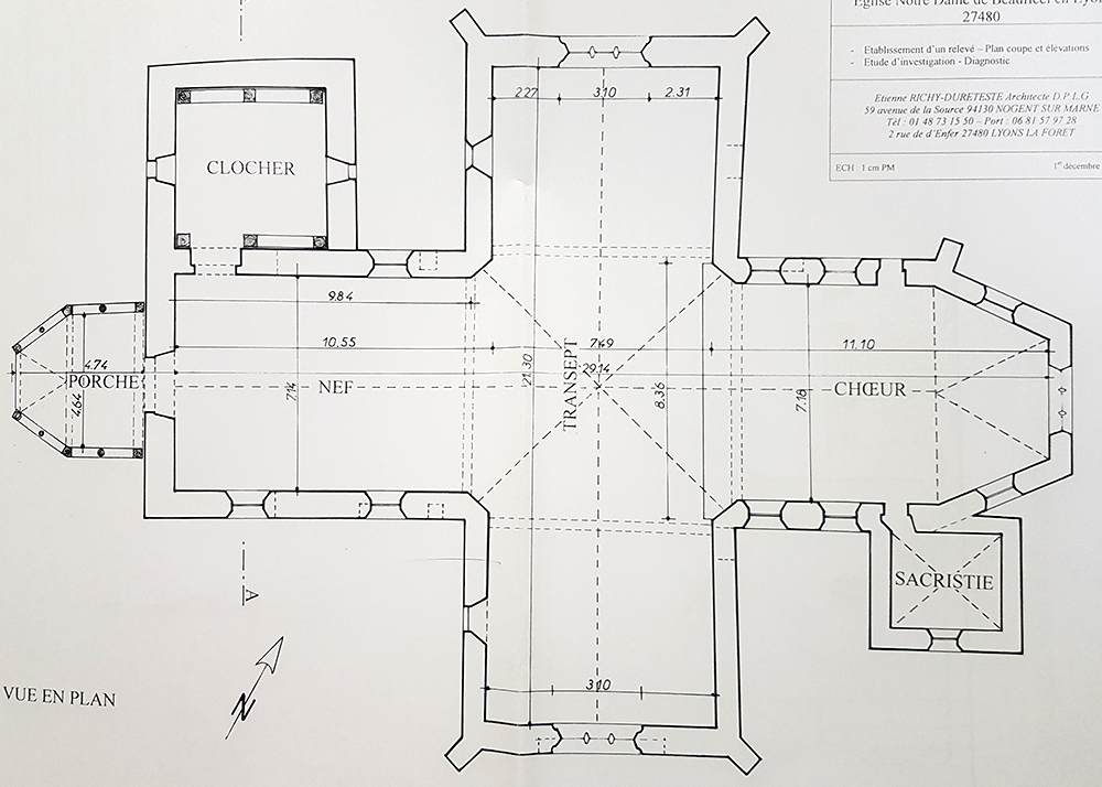 L’église Notre-Dame de Beauficel-en-Lyons, orientée et située dans son enclos paroissial, est de plan cruciforme composé d’Ouest en Est: