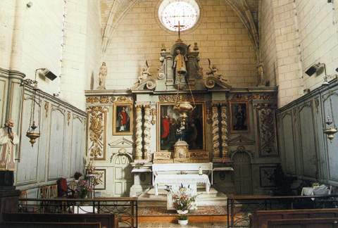 Le transept et le chœur à chevet plat ont été construits au XIIIe siècle. Ils sont voûtés en pierre sur croisées d’ogives et éclairés par des fenêtres à lancettes et par un grand oculus sur le pignon oriental. La grande dimension de ces ouvertures correspond à l’élévation de cette partie de l’édifice. Celles du côté sud du transept et du bas du chevet oriental ont été murées par les adjonctions du XVe s. (au sud) et du XIXe s. (sacristie à l’est). Un somptueux retable à colonnes torsadées, trophées et ornements dorés, tableaux et sculptures avait déjà permis de ménager une sacristie derrière l’autel au XVIIIe siècle. Il s’agit du réemploi du riche décor d’une église plus importante dont on a tenté de réadapter les éléments à la largeur disponible du chœur. Un clocher du XIIIe s. a été accolé sur le côté occidental du bras nord du transept, il est percé de baies géminées en tiers-point au niveau du beffroi.