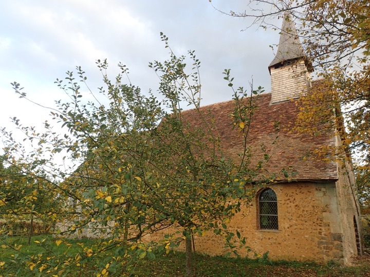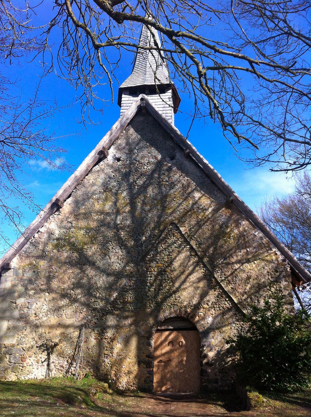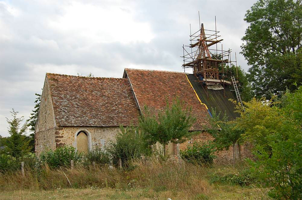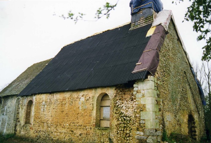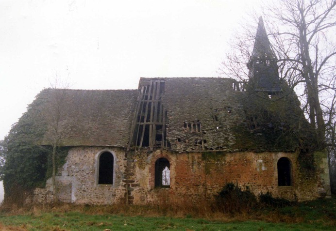 L’église de Pierre-Ronde sur la commune de Beaumesnil, placée sous le vocable de saint Cyr et sainte Julitte, un fils et sa mère martyrisés au IVe s. à Tarse, est de nos jours un édifice totalement abandonné au milieu d’un cadre champêtre. Elle avait pourtant été l’église paroissiale de la commune de Pierre-Ronde rattachée à celle de Beaumesnil en 1845. Désaffectée au début de ce siècle, elle fut vendue à un particulier il y a une trentaine d’années. A vaisseau unique, la chapelle comprend une nef et un chœur, tous deux de plan rectangulaire, le chœur plus étroit s’achevant par un chevet plat. Les deux parties de l’édifice se distinguent aussi par la différence de volume des toitures ; celle de la nef, plus élevée, est surmontée d’un petit clocher d’ardoise qui contraste avec le reste de la couverture de tuiles. A l’intérieur, la chapelle est couverte d’une assez rare voûte lambrissée, en très mauvais état, qui a conservé des éléments de polychromie ; certaines pièces de la charpente sont ouvragées. Deux fenêtres, l’une du XIIIe s., l’autre du XVIIe s. s’ouvrent sur la façade sud : ainsi distingue- t-on, au milieu de la végétation, une élégante baie trilobée. L’édifice, ouvert à tous vents, menaçait de s’écrouler. Une association de sauvegarde s’est constituée, à laquelle la Sauvegarde de l’Art Français a octroyé en 1994 une aide de 24 000 F, destinée à aider le chantier de jeunes bénévoles engagé dans la restauration de la chapelle ; la campagne de travaux concerne la restauration du clocher, des murs gouttereaux et de la couverture de la nef.