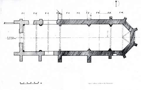 La partie orientale de l’église est la plus ancienne. Elle se compose d’une travée droite, éclairée initialement par des baies géminées. L’alternance des retombées permet de restituer un voûtement sexpartite. L’abside polygonale à cinq pans, extrêmement élancée, était éclairée par de vastes baies en arc brisé, flanquées de colonnettes et coiffées d’archivoltes. Des contreforts à retraits soigneusement appareillés scandent le volume extérieur d’un chevet d’ une grande élégance, malgré des reprises plus tardives dans l’appareillage du mur de soubassement.