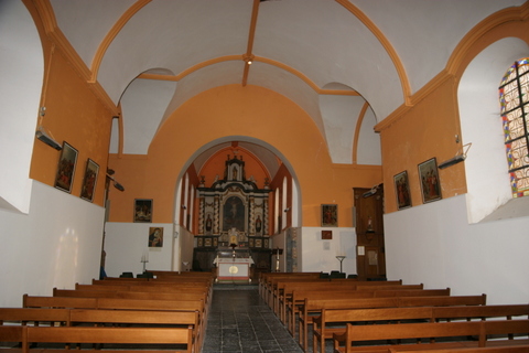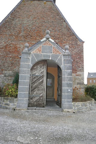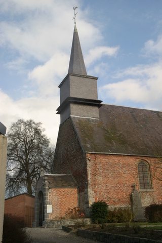 L’église fut alors relevée en briques à partir d’un important soubassement fait de grès et de pierre bleue, plus ou moins soigneusement piqués et assisés. La nef porte la date de 1673, la façade ouest et la couverture du chœur celle de 1683. Sur les maçonneries de briques se détachent quelques motifs légèrement surcuits, en particulier un cœur et une croix formée à partir de cinq losanges. Le petit porche en pierre bleue est un ajout de 1753.
