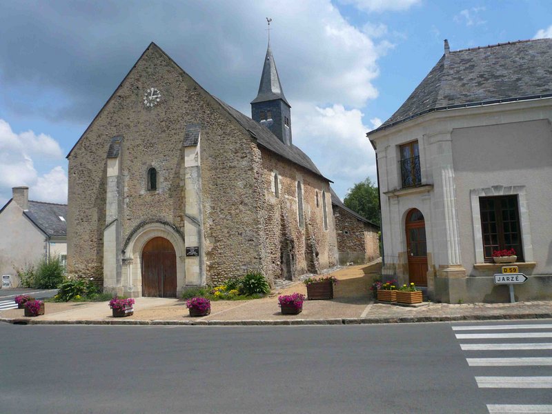 L’église est fondée au IXème ou Xème siècle, puis reconstruite au XIIème siècle. Elle fut alors cédée par le seigneur de Jarzé à l’abbaye de Saint-Serge qui y fonda un prieuré. Le chœur est rebâti par Geoffroy de Jarzé à la fin du XIIIème ou au début du XIVème siècle siècle. Le clocher est abattu au XIXème siècle.