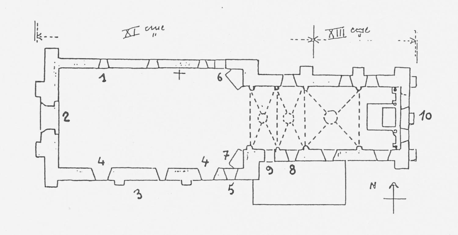 Eglise composée d’une nef unique de trois travées, d’un chœur plus étroit long de 3 travées et terminé par un chevet plat. La couverture est en ardoise et les murs sont fait de moellons enduits. Une voûte lambrissée couvre la nef tandis qu’une voûte en briques enduites de style Plantagenêt est installée sur le chœur.