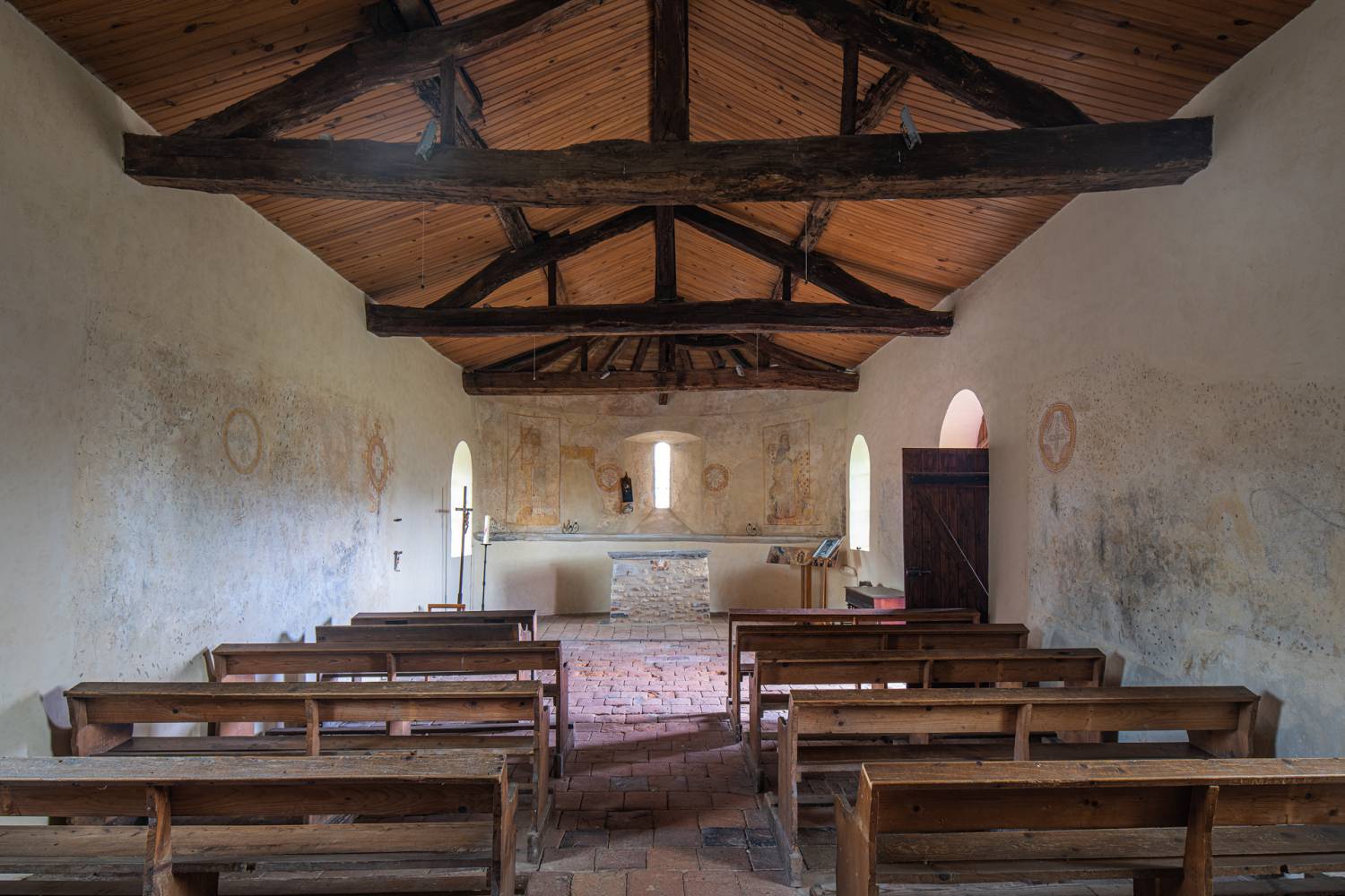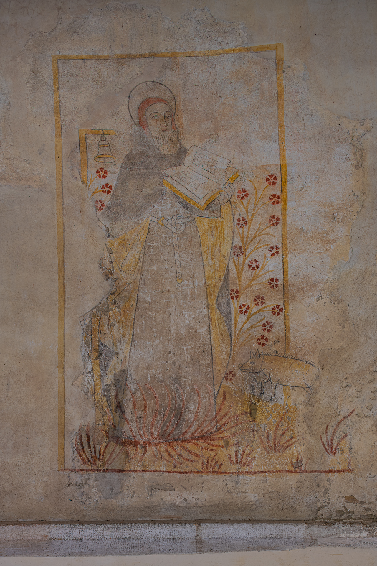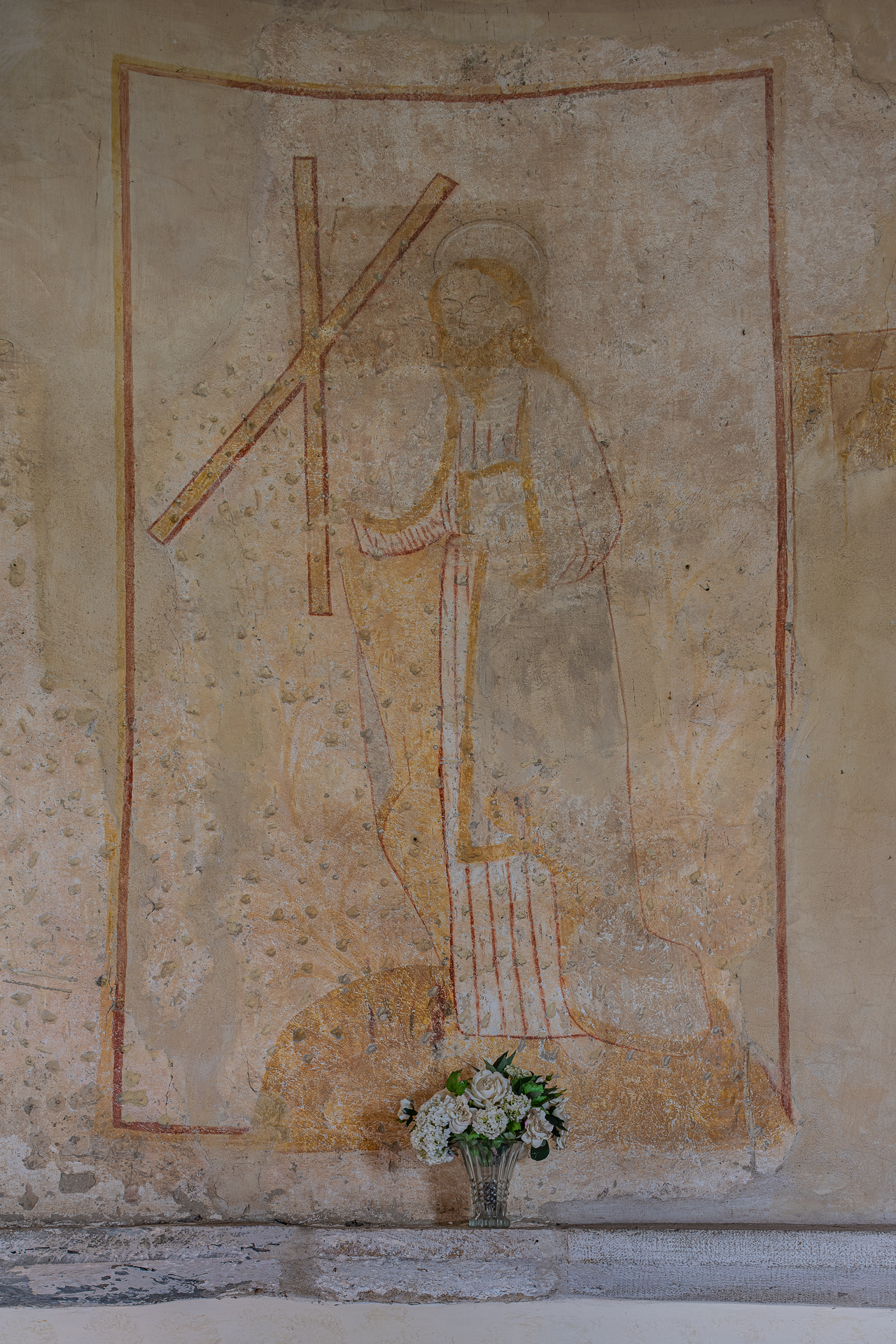 L’intérêt de cette chapelle réside surtout dans les peintures murales qui décorent les murs intérieurs et dont une grande partie a déjà été restaurée. Dans le chœur, de part et d’autre de la fenêtre centrale récemment réouverte, figurent, à gauche, saint André tenant sa croix, le patron de la chapelle, et, à droite, saint Antoine reconnaissable à sa clochette, au cochon qui l’accompagne et au feu qui entoure ses pieds (le mal des ardents ou feu de saint Antoine). Ces deux personnages sont encadrés par un trait à l’ocre et sont environnés de fleurs à tiges et pétales stylisés. Les murs latéraux ont conservé leurs croix de consécration peintes à l’ocre à intervalles réguliers. Le mur nord offre en outre un grand dessin au crayon ou à la mine de charbon représentant saint Michel pesant les âmes et terrassant le démon. Une figure assez semblable se voit non loin de là, dans l’église de Saint-Maurice-de-Gourdans. Cet ensemble pourrait dater du XVe s., comme le suggère l’armure de l’archange, ce qui confirmerait la date avancée par la visite de 1655. Ces peintures ont été restaurées en 1987-1988.