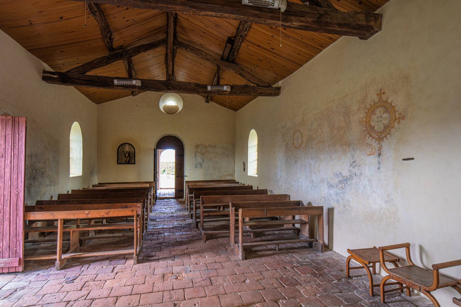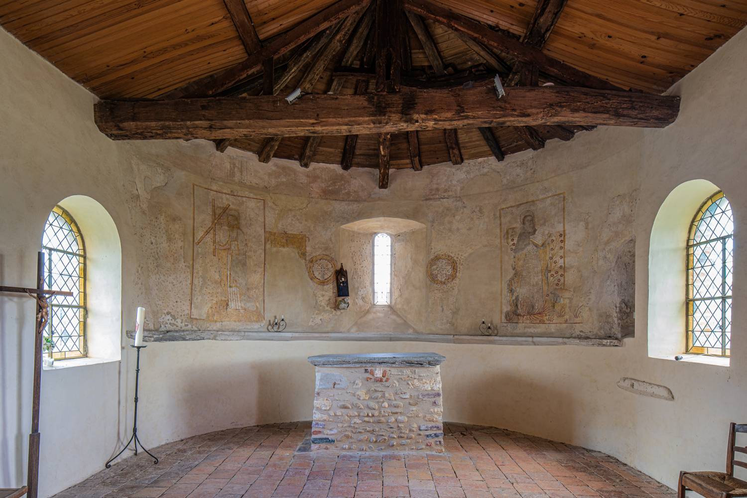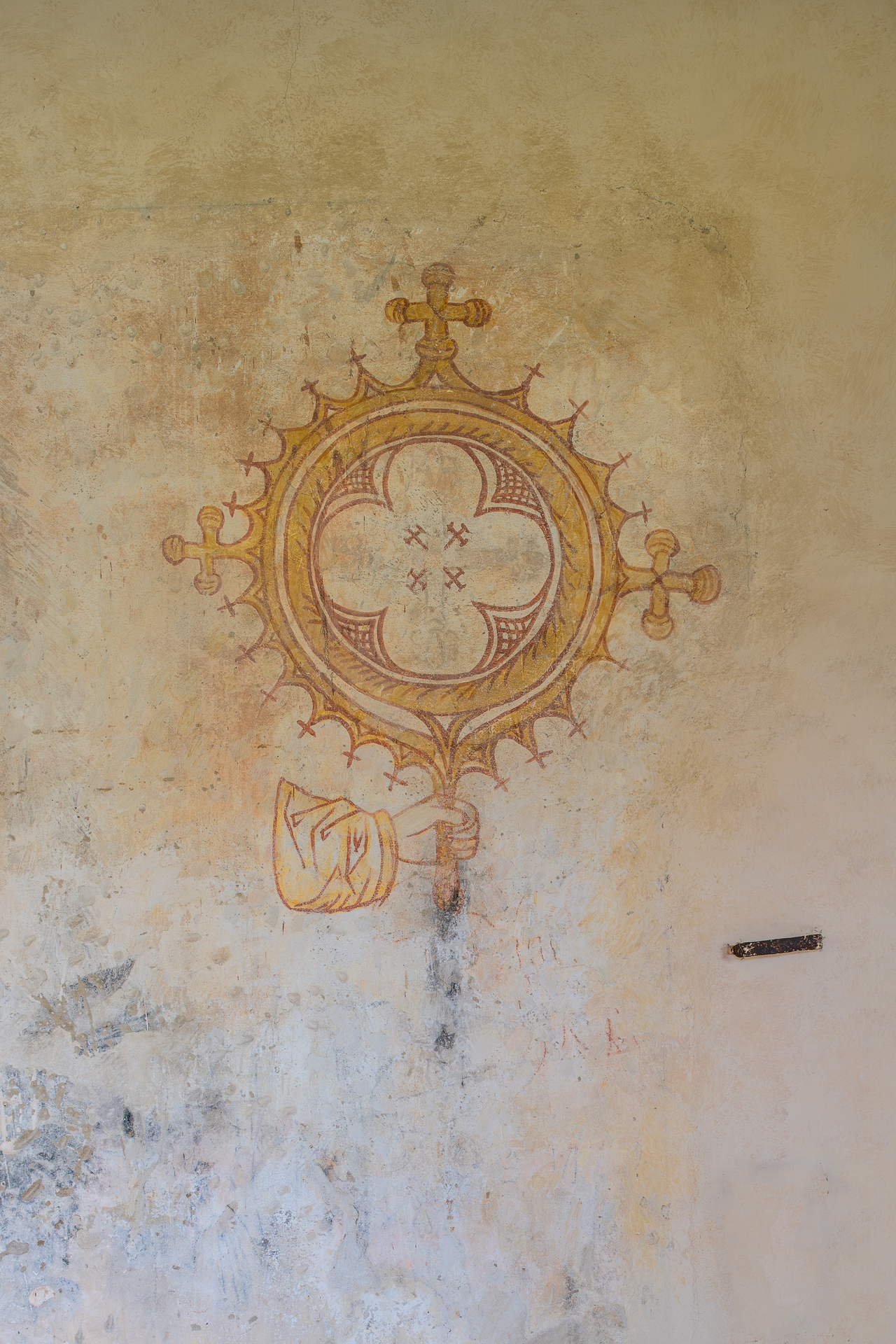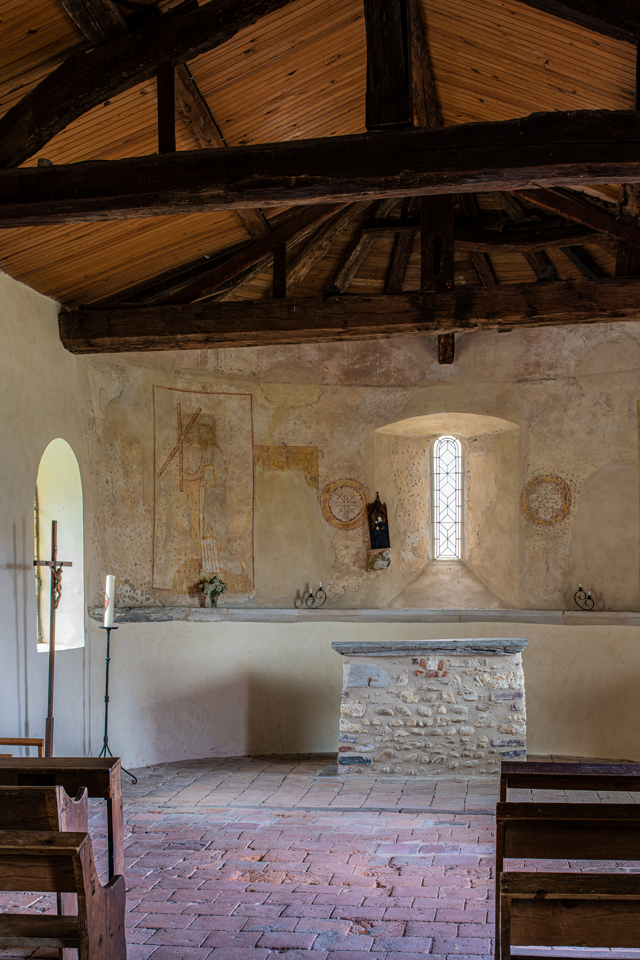 L’intérêt de cette chapelle réside surtout dans les peintures murales qui décorent les murs intérieurs et dont une grande partie a déjà été restaurée. Dans le chœur, de part et d’autre de la fenêtre centrale récemment réouverte, figurent, à gauche, saint André tenant sa croix, le patron de la chapelle, et, à droite, saint Antoine reconnaissable à sa clochette, au cochon qui l’accompagne et au feu qui entoure ses pieds (le mal des ardents ou feu de saint Antoine). Ces deux personnages sont encadrés par un trait à l’ocre et sont environnés de fleurs à tiges et pétales stylisés. Les murs latéraux ont conservé leurs croix de consécration peintes à l’ocre à intervalles réguliers. Le mur nord offre en outre un grand dessin au crayon ou à la mine de charbon représentant saint Michel pesant les âmes et terrassant le démon. Une figure assez semblable se voit non loin de là, dans l’église de Saint-Maurice-de-Gourdans. Cet ensemble pourrait dater du XVe s., comme le suggère l’armure de l’archange, ce qui confirmerait la date avancée par la visite de 1655. Ces peintures ont été restaurées en 1987-1988.