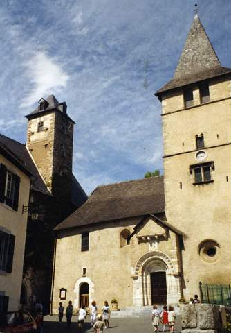 L’église, insérée dans le village, est couverte d’ardoises ; la pierre appareillée, à la partie inférieure du chevet, contraste avec sa surélévation en moellons. Le sol fait alterner des dalles de schiste bleu et de marbre blanc ; le nombre et la qualité des ouvrages taillés dans ce matériau (marbre veiné de Louvie–Soubiron utilisé pour le portail, les chapiteaux, le bénitier et la cuve baptismale) enrichissent ces effets de décoration minérale. L’abside (XIIIe siècle ?) voûtée en cul-de-four rappelle l’origine romane de l’édifice qui, à cette exception près, remonte au XVe et au XVIe siècle ; en 1550, on peinait encore à poursuivre et achever les travaux. La nef a été voûtée d’ogives au XVe s., sans surélévation, d’où l’abaissement visible des départs de voûte, sans doute pour respecter en hauteur les volumes d’un ancien berceau de bois. Elle est flanquée d’un bas-côté au sud et de deux chapelles au nord. Le clocher carré du XVIe s., à trois étages et fenêtres gothiques tardives, abrite deux cloches de bronze du XVe siècle. Une restauration générale a été effectuée au XIXe s. et une sacristie ajoutée au sud-est à cette époque. Á la fin du XIXe s., il fut en outre procédé à la décoration peinte des murs et des supports, mais cette ornementation n’a pas été épargnée lors de la campagne de restauration engagée en 1968.