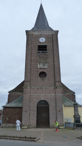 [2] Y compris les angles des contrefort plats du clocher et des collatéraux. Les seules exceptions consistent en quelques pierres bleues du Hainaut en remploi, ainsi que dans les corniches et rares larmiers en pierre crayeuse de Hordain.