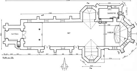 L’architecture de l’église est simple : à l’origine à nef unique terminée par un chevet à pans coupés, elle a été peu à peu agrandie par l’adjonction d’une sacristie au nord du chevet et de deux chapelles formant faux transept, l’une au sud en 1753, l’autre au nord en 1781 ; un clocher est construit à la même époque. D’importants travaux ont également été réalisés à la fin du XIXe s. et au début du XXe siècle : construction de voûtes en plâtre sur lattis de châtaignier, construction d’une tribune contre le mur occidental, remaniement des baies de la nef et reconstruction du clocher par le chanoine Abgrall.