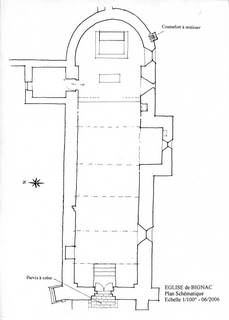 L’église paroissiale Saint-Martin de Bignac, ancienne dépendance du prieuré conventuel augustin de Lanville (Marcillac-Lanville, Charente), est un édifice à la longue nef unique, jadis voûtée en berceau brisé, couverte d’une charpente, aujourd’hui apparente, mais naguère dissimulée par un plafond, et terminée, à l’est, par une abside de plan semi-circulaire. Un relevé pierre à pierre du bâti permettrait peut-être d’en reconstituer l’histoire, car les murs actuels ont manifestement réutilisé des matériaux, voire même des pans entiers de maçonnerie, correspondant aux états successifs de cette église, manifestement ruinée et réparée à plusieurs reprises. Le portail de la façade occidentale comporte trois voussures nues, retombant sur de simples impostes, encadrées par un cordon orné de pointes de diamants (ou de « têtes de clous ») ; il date sans doute de la fin du XIIe siècle. Juste au-dessus, une fenêtre a été ouverte dans ce qui était peut-être, à l’origine, une simple niche ; le style de son riche encadrement (et en particulier des deux consoles figurées qui soutiennent ses piédroits) permet de la dater, comme la fenêtre sud de la travée droite précédant le chœur, du début du XVe siècle. La chapelle sud (à fonction funéraire ?), large et peu profonde, couverte d’un berceau brisé perpendiculaire à l’axe de la nef, est plus difficile à situer chronologiquement ; dans son état actuel elle ne paraît pas antérieure au XVIIe siècle. Tout aussi difficile à dater, le clocher-peigne qui couronne la façade abrite une cloche portant la date de 1666 ; les vestiges, au nord, d’un ancien escalier d’accès, semblent correspondre à un état plus ancien dont les dispositions exactes restent inconnues.