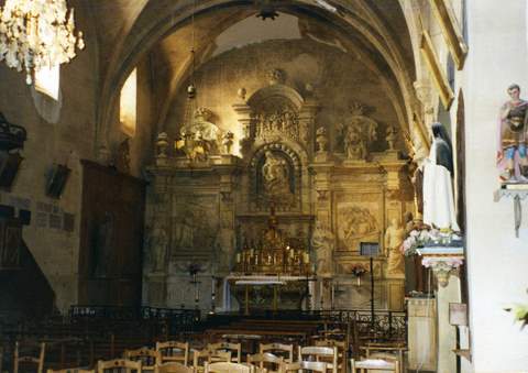 La pièce la plus remarquable de cette église est le retable de pierre de grandes dimensions qui en orne l’abside : on l’a attribué à Gervais Drouet, auteur du jubé de Sainte-Marie d’Auch, daté de 1671 (et démoli au XIXème s., mais il pourrait également être dû au sculpteur Jean Douillé auquel furent commandés en 1662 treize retables pour les chapelles de Sainte-Marie d’Auch. Le nom d’Antoine Guépin, gendre du sculpteur Pierre Affre, a été récemment avancé comme plus probable.