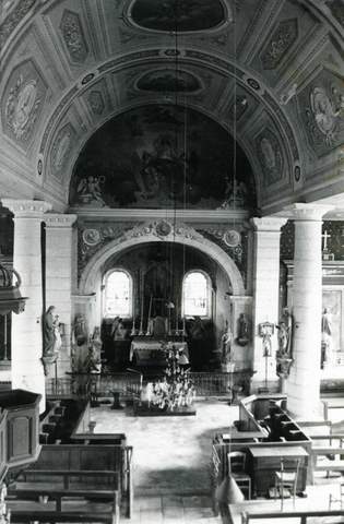 L’église Saint-Symphorien de Bligny est un petit édifice entièrement construit à la fin du XVIIIème s. Il se compose d’un clocherporche, d’une nef de trois vaisseaux séparés par de grosses piles rondes et d’un chœur à chevet plat d’une seule travée. La construction est en moellons, à l’exception du mur pignon est, qui est à pans de bois. Par son aspect extérieur, cette église reflète bien la pauvreté de la région de Bar-sur-Aube à la fin de l’Ancien Régime. L’intérieur, en revanche, entièrement décoré au XIXème s., est étonnant : dans le vaisseau central de la nef, une voûte à caissons d’ une richesse disproportionnée à l’édifice, avec arcs doubleaux, stucs et fresques, est peinte en trompe-l’œil sur un support de bois. Les plafonds des bas-côtés et la voûte d’ogives du chœur ont subi un traitement similaire, et pas une parcelle de mur ne semble avoir échappé au pinceau du décorateur. L’ensemble n’est d’ailleurs pas sans intérêt, d’autant que l’édifice a conservé une partie de son mobilier ancien, donc un fauteuil Louis XVI classé Monument historique. L’église se trouve menacée par des infiltrations d’eau, provenant à la fuis du mauvais état de la toiture et de remontées par capillarité. Pour la réfection de la couverture et la reprise des maçonneries endommagées, la Sauvegarde de l’Art français a accordé 60 000 F en 1990.