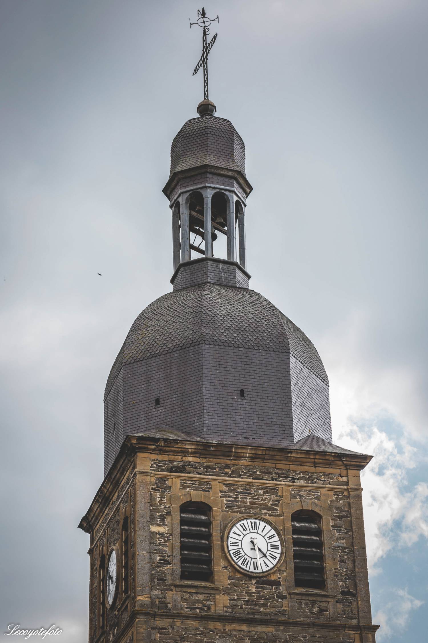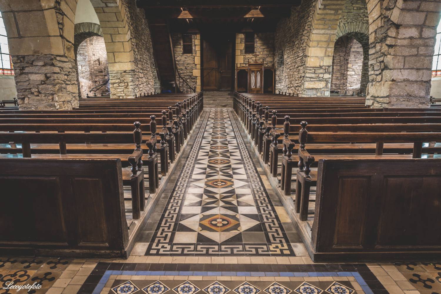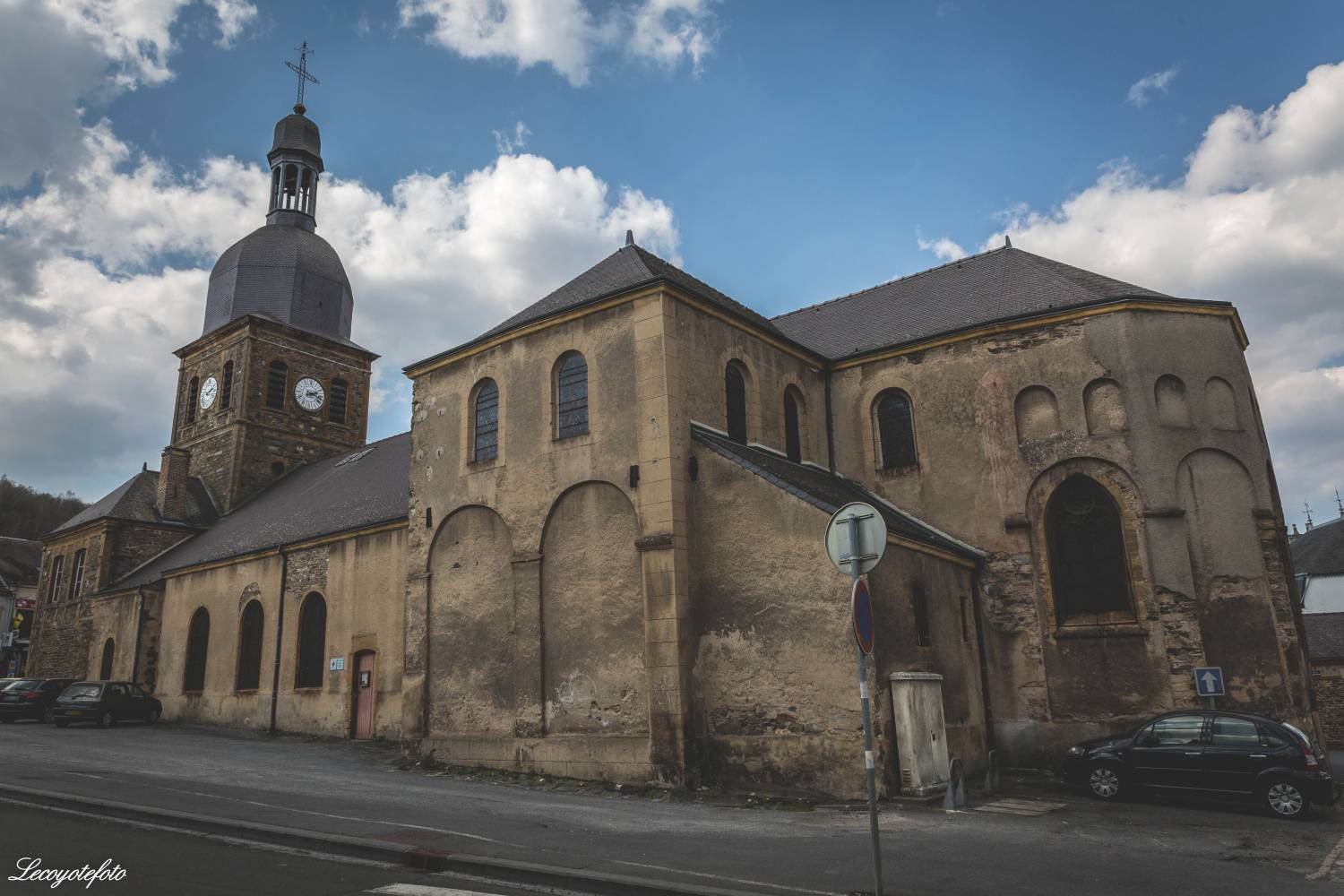 Le transept est saillant et son bras nord présente une chapelle orientée qui communique avec le choeur par le biais d’un petit vestibule. Le massif occidental est élevé en moellons de quartzite et de schiste avec chaîne d’angle et encadrements en pierre de Dom-le-Mesnil. Le reste de l’édifice comporte des baies et corniches en calcaire jaune et la maçonnerie est recouverte d’un crépi moucheté. Le sol du choeur est couvert d’un damier de marbre noir veiné blanc et rouge veiné et celui du reste de l’édifice a reçu des carreaux à motifs polychromes.