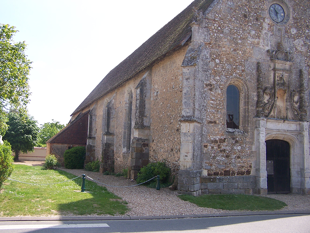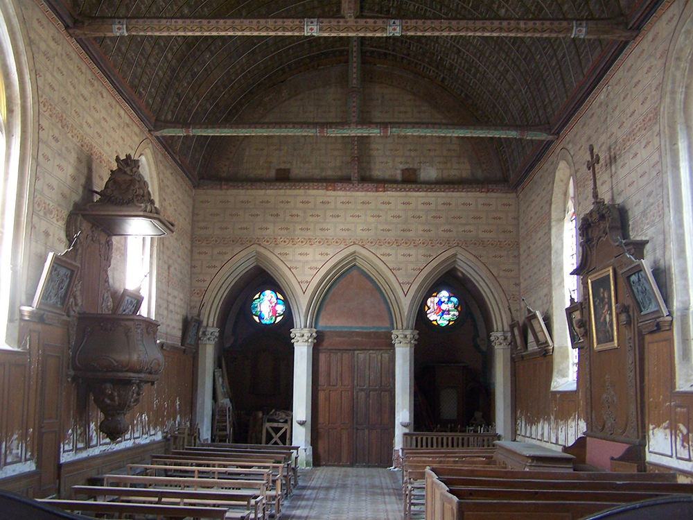 L’édifice est couvert d’une charpente à chevrons formant fermes entièrement lambrissée, dont le décor au pochoir a été repris au XIXe s. par des entreprises de peinture drouaises. Mais c’est probablement la campagne du début du XVIe s. qui retient l’attention. En effet, sur la façade ouest a été greffé un portail renaissant, en calcaire tendre, constitué de deux pilastres à décor de candélabres pourvus de chapiteaux soutenant un entablement, au-dessus du portail à voussures, finement ciselé d’un rinceau floral. Le tout est surmonté par une niche à dais qu’encadrent deux poissons et deux balustres, et couronné par un motif proche d’une lucarne. Cet élément remarquable de la première décennie du XVIe s. reflète les premières introductions du style renaissant dans l’architecture religieuse. L’on pense également au portail de l’église de Pierres sur la vallée de l’Eure.