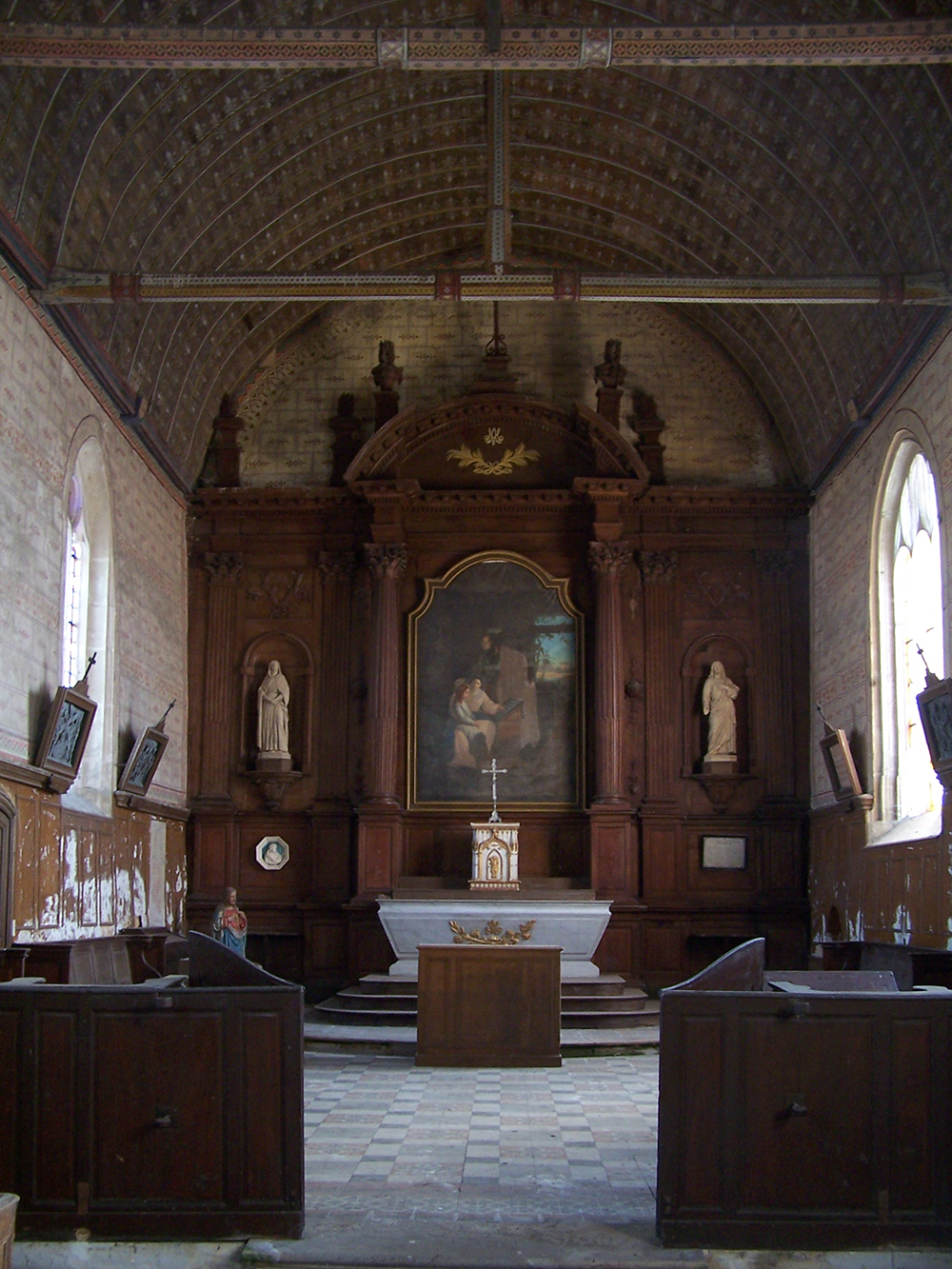L’intérieur de l’église reflète par son mobilier les grandes commandes réalisées à partir de 1759 pour renouveler le décor des églises paroissiales rurales. L’on remarque notamment le grand retable monumental du chœur, mais également le banc d’œuvre et surtout la chaire, en bois et plâtre, mise en place, en 1759, en implantant dans le mur arrière un escalier d’accès. Cet ensemble mobilier accompagne les décors peints du XIXe s. que ce soit le faux-appareil des murs ou le décor au pochoir de la voûte lambrissée.